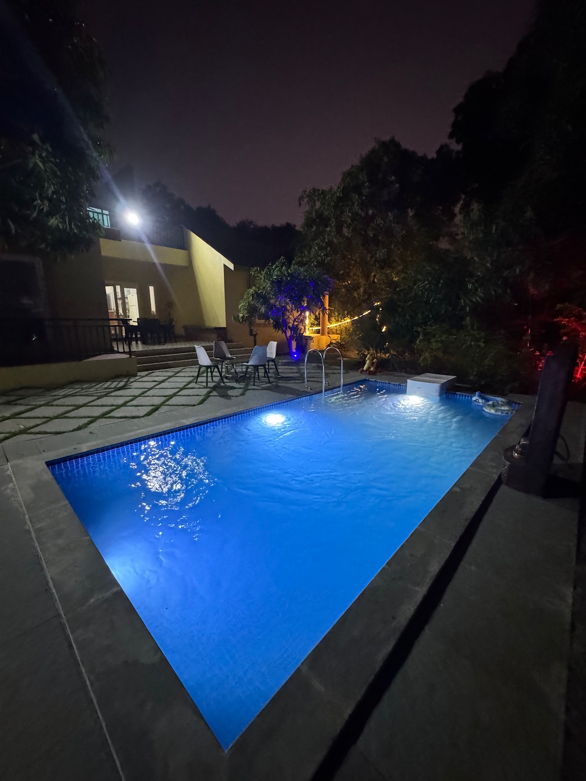 Aminities ; -3 bedroom (2Ac & 1 Non AC Bedroom) -3 Washroom ( 2 Attached & 1 common) -Smart Tv -Wifi -Dinning room -Lush greenery lawn -Seperate Recreational space -Covered private swimming pool -Kitchen access chargeable 1500 charge -Bbq access Chargeable -Caretaker available -Hotel delivery available - Bath tub Attached in 1Room 🛁 Note -: We allowed mix crowd & family. - Noise restriction are there keep in low volume -Security deposit 3k refundable at check out time