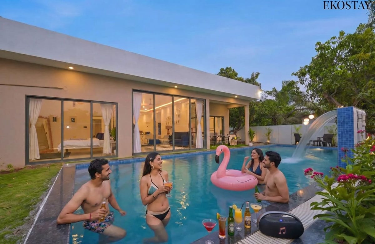 Welcome to your dream getaway – a stunning, architecturally designed villa nestled by a serene lake, featuring a private pool, lush greenery, and beautifully curated interiors. Highlights : • Elegant Architecture: A unique circular facade with floor-to-ceiling glass doors. • Private Pool & Deck: Swim in complete privacy with ample seating outdoor dining area. • Stylish Interiors: The villa boasts a spacious living room with designer tile flooring, plush velvet sofas, and a grand TV wall.