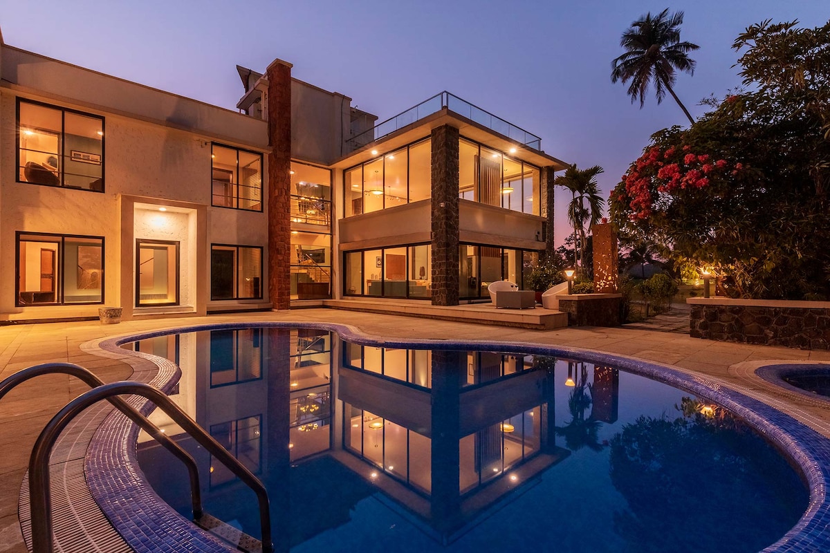 PrivyStays, Alibaug’s #1 villa hosting company with 20+ premium homes and 5000+ happy guests, presents this stunning 7BHK private villa near Nagaon Beach. Surrounded by lush greenery, it features a private pool, lavish interiors, rooftop jacuzzi, and a theatre room for movie nights. Perfect for large groups, this villa blends luxury, comfort, and entertainment—ideal for family vacations, celebrations, or peaceful retreats in a serene setting.