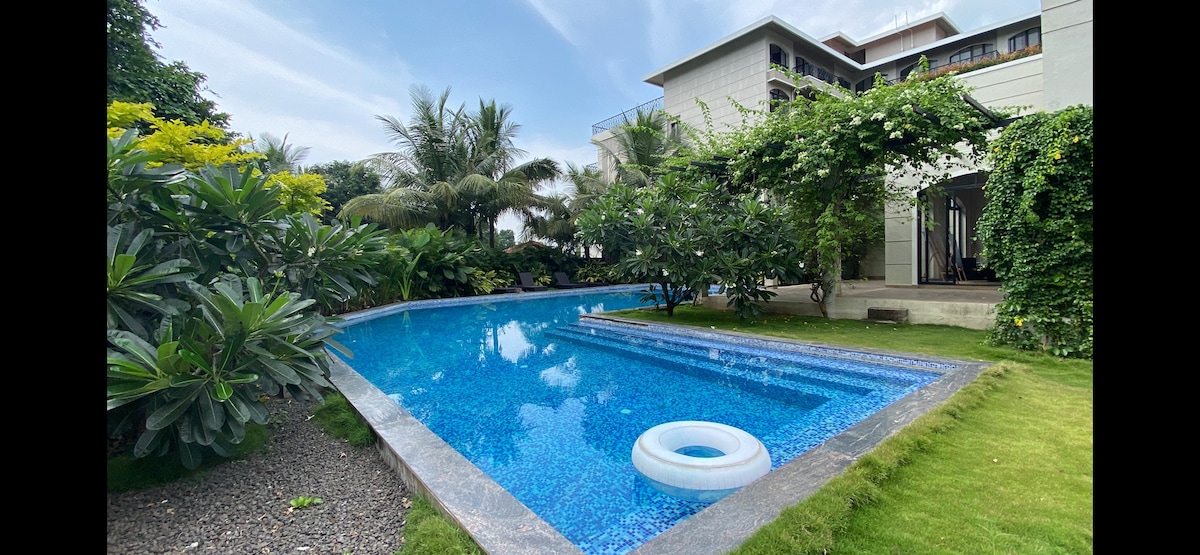 Escape to a luxurious 4BHK Alibaug sky villa penthouse with a rooftop private pool with scenic views. Including a clubhouse pool,Surrounded by lush greenery, this family friendly , pet friendly retreat offers spacious lounges, stylish interiors, and dining spaces. Perfect for beach getaways, group stays, and weekend escapes near Mumbai. Unwind, recharge, and make lasting memories in nature’s lap. Best Airbnb In Alibagh .