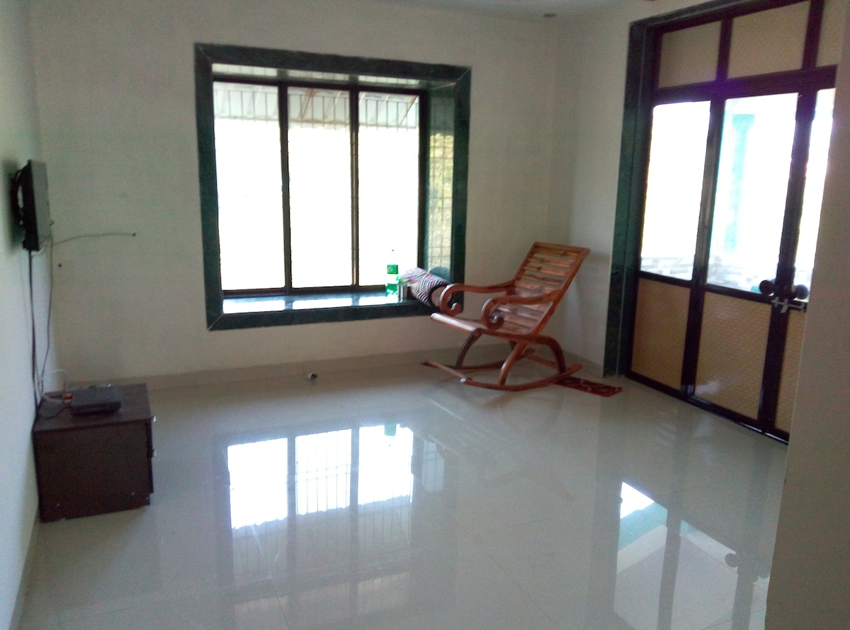 Full bungalow. 2 air-conditioned bedrooms with attached bathroom, kitchen with fridge and microwave. 500meters from kashid beach, 5-10 mins walk. Complete privacy, 50mbps optical fiber WIFI connection, Breakfast included. Parking available. Max 6 members IMPORTANT Kitchen for reheating food only. Fridge use OK Low network coverage area Weekly electricity cut, Tuesdays 10am-6pm, No AC in these times. Main road 300m, shops 1km away, bring all essentials or inform caretaker in advance.