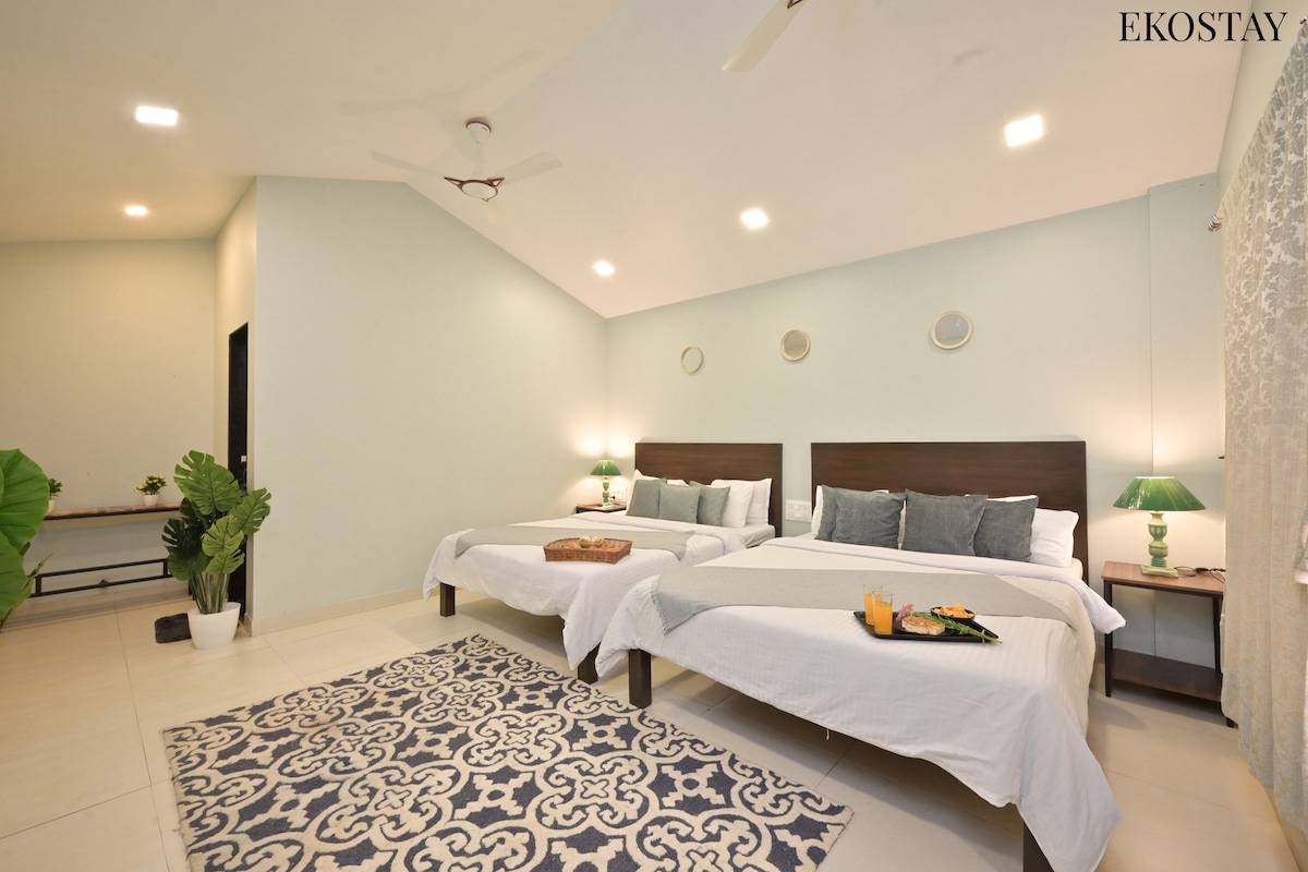 Inspired by slow mornings and garden views, this recently renovated villa comes with a green-toned suite offers two double beds, a bathtub with airy lighting. Ideal for families looking for Weekend Getaways or close-knit friend groups. Perfect for a bachelorette parties. Birthday celebrations, and Bachelorette. Short trips recommended: Nagaon beach - 5 kms away, Kankeshwar temple, Karmarkar Museum.