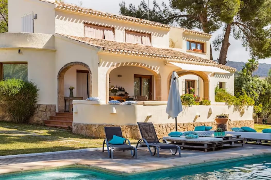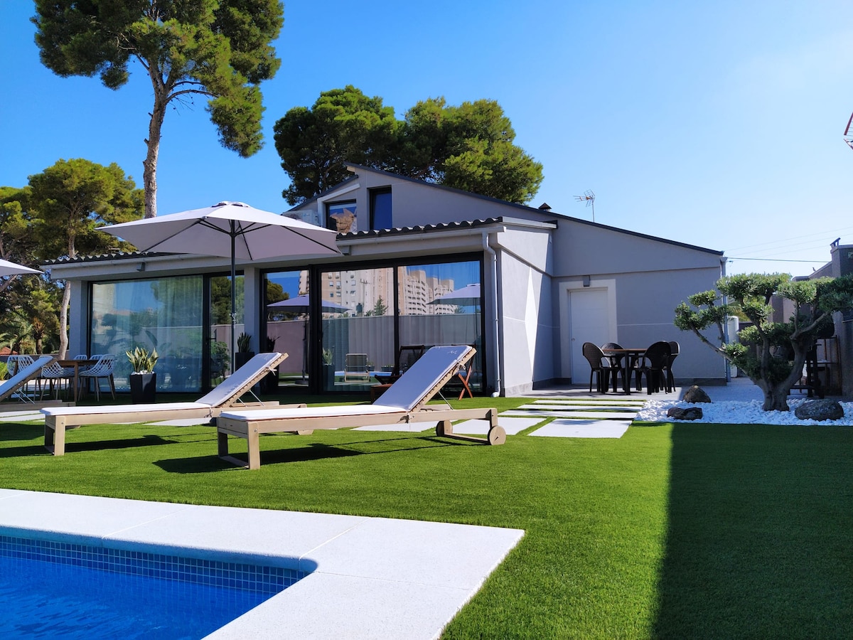 Design and brand new villa (independent with terraces with a private heated plunge pool) in a condo with swimming pool, garaje, kids play area and next to the beach. Full equiped kitchen. (220 meters in 3 levels) Stunning views of sea and mountains. Chalet independiente con parcela y piscina privada climatizada, en urbanización con piscina comunitaria, con acceso directo a la calle de la playa. Muy amplia, con Garaje. Zona muy tranquila. Frente a cala de piedra y a 300m playa arena