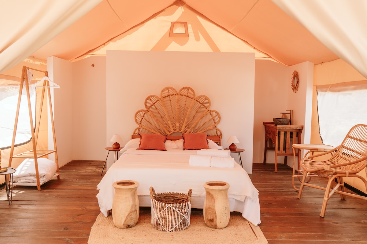 Enjoy the lovely setting of this romOur private glamping tents with their cozy decor are perfect if you’re seeking a truly unique outdoor experience. Equipped with a double bed and a shared bathroom, they’re ideal for friends and families looking to explore the Mediterranean outdoors without sacrificing comfort. Our camp has different areas: pool, bar, restaurant, and a chill area. All the facilities at the camp are shared, including toilets and bathrooms.antic spot in nature.