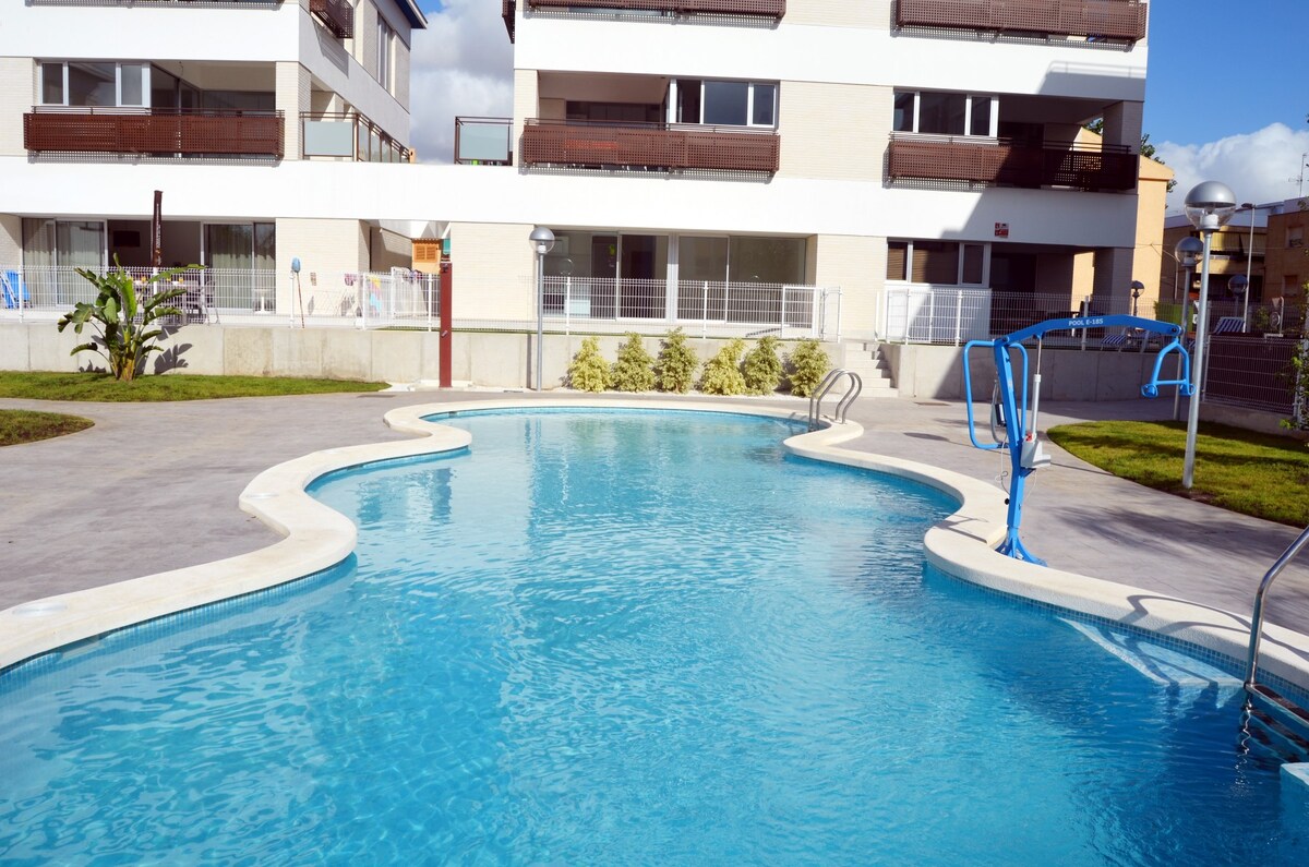 一楼公寓,带露台,可欣赏泳池景观,提供无线网络