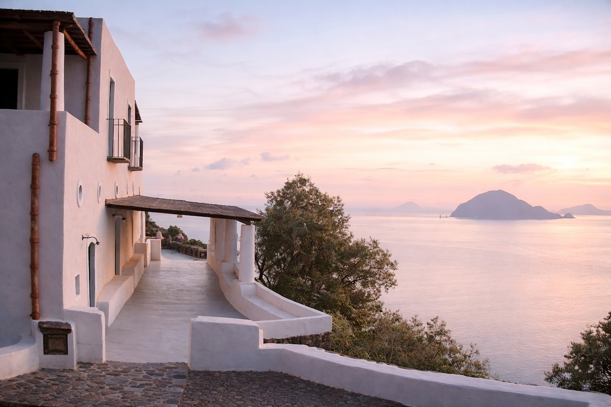Take it easy at this unique and tranquil getaway. Perched on a secluded hilltop, this rustic Aeolian-style home offers breathtaking views of the sea, mountains and the Islands. Surrounded by nature and a large peaceful private garden filled with lemon and orange trees, it's a home that celebrates simplicity and beauty, designed for quiet mornings, long meals and star-filled nights. While sipping your aperitivo and olives in the evening you'll witness the best sunsets on the terrace and garden.