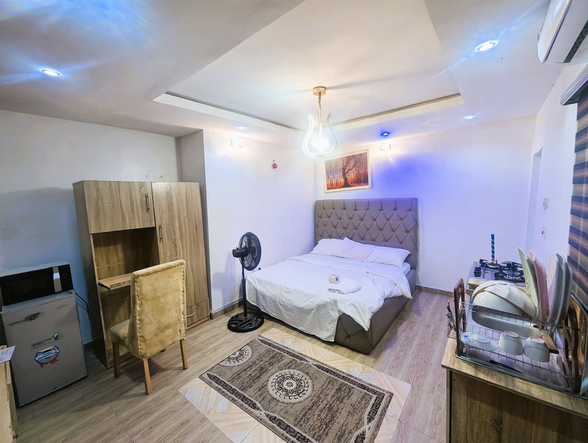 Standard ensuite room with semi orthopedic super king size comfortable mattress, modern bathroom with water heater. Unlimited fast WI-FI, 43inches Smart Tv in the bedroom and 55 inches Smart Tv in the sitting room, Netflix, YouTube, DSTV, Smoke alarm, 24/7 electricity with Band A supply frm the grid make my place unique wit no Blackout, Cctv, maximum security, 10min to International Airport and 5min to Domestic Airport. Sparkling clean, spacious and well organised Apartment for your comfort