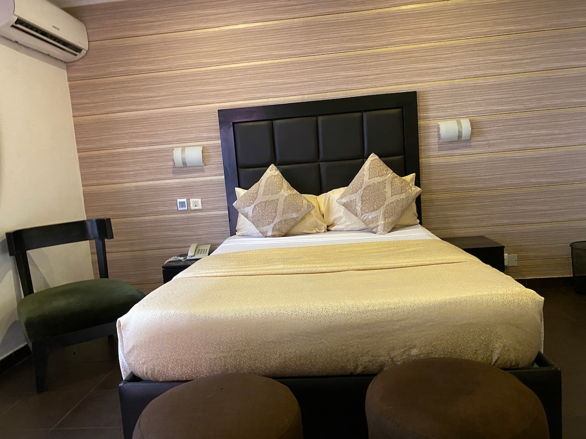 Experience Comfort and Class at Tonelz Executive Hotel Room — where luxury meets relaxation. This stylishly furnished room offers a cozy king-size bed, air conditioning, a flat-screen TV, free Wi-Fi, and an ensuite bathroom designed for your comfort. Guests enjoy 24-hour power supply, security, and easy access to nearby restaurants, lounges, and shopping centers. Perfect for business travelers, couples, or anyone seeking a serene and secure stay in the city.