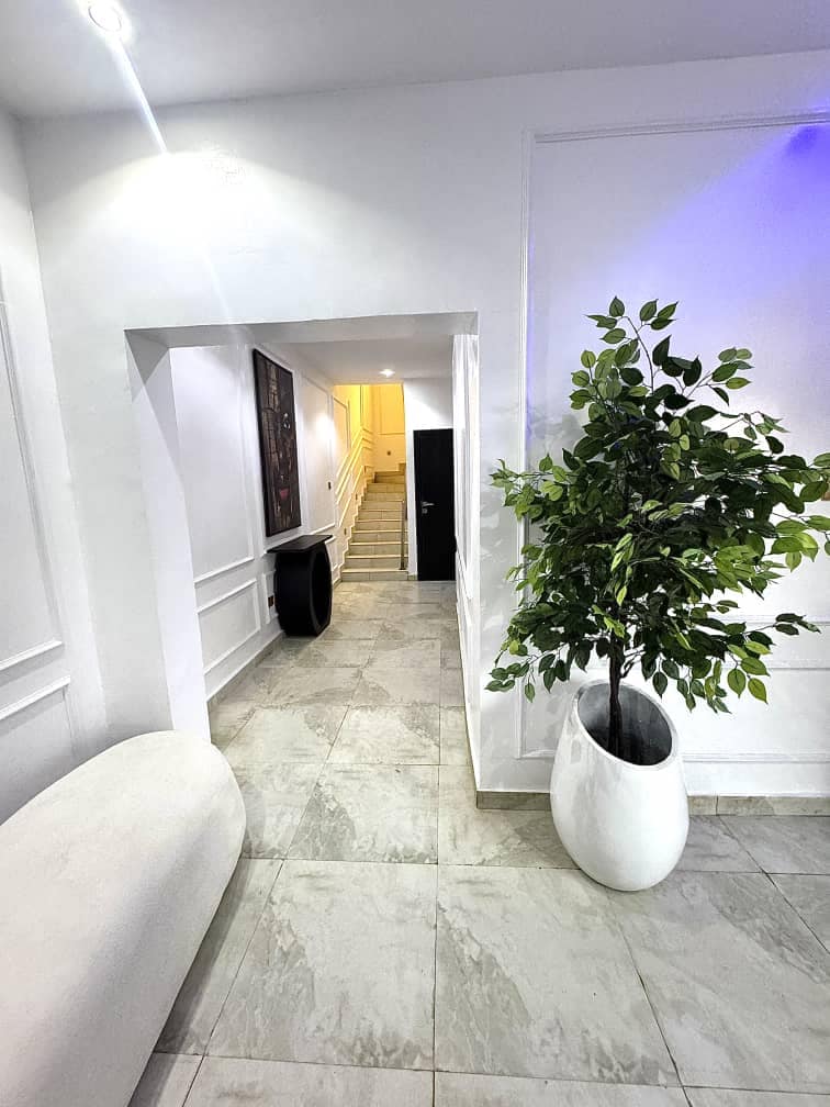 A one bedroom, bathroom and living room apartment with a blend of Afrocentric and modern contemporary wood designs. In house spa- a sauna, steamer and massage rooms-, in house restaurant, gym and coffee lounge, outdoor pool with a poolside Pergola, 24/7 power, security and cctv. It’s ideal for both long and short stays with a minimum of three days located five minutes drive from the international airport and twelve minutes drive from the domestic airport. Airport pickup and dropoffavailable