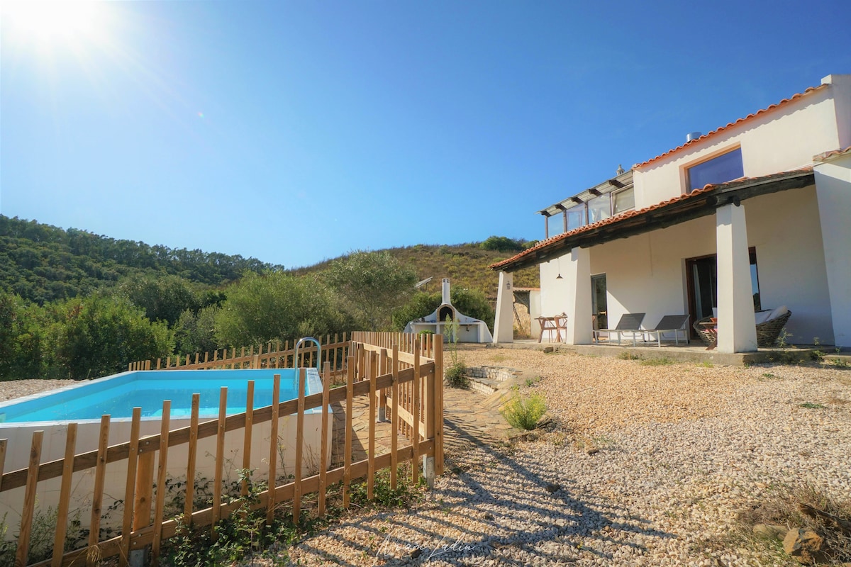 "Relax in this unique and peaceful accommodation. The house is filled with natural light and exudes a special energy. The kitchen has everything your heart desires, and there's a laundry room for convenience. A cozy dining area promises delightful meals. As Portugal can be windy, the garden is perfectly positioned at the back to shield from the cold winds, allowing for ultimate relaxation. . An outdoor shower is available for a refreshing cool down. The house is a 5-minute drive from the beach.