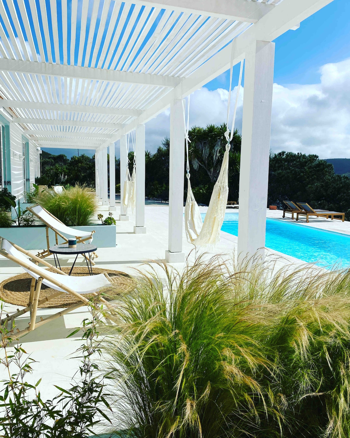 Take it easy at this unique getaway! In the middle of nature but only a 2 minute drive to town. You have your own space (studio) and access to the swimming pool and big beautiful garden. You can do beautiful hikes from here or drive to the great surf beaches in 12 minutes. The pool and garden are shared with the owners of the property. There are dogs bunnies and parakeets only for those who like animals. The studio is fully equipped with a kitchen, fridge, bathroom with shower and toilet.