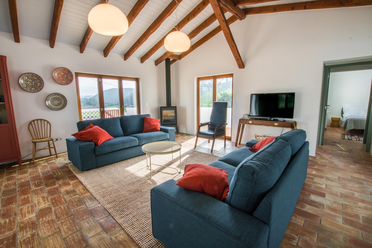 Ideal for families and nature lovers. Quiet and relaxing place in the heart of the Vicentine coast. Beautiful land with spacious, comfortable and stylish houses. A haven for beach and countryside lovers, 5 minutes from the village of Aljezur and 15 minutes from beaches for all tastes. Ecologic Taipa construction, off-the-grid, 100% solar energy with batteries, water coming from the well. You can rent Casa Poente alone or Casa Poente and Casa Nascente together.