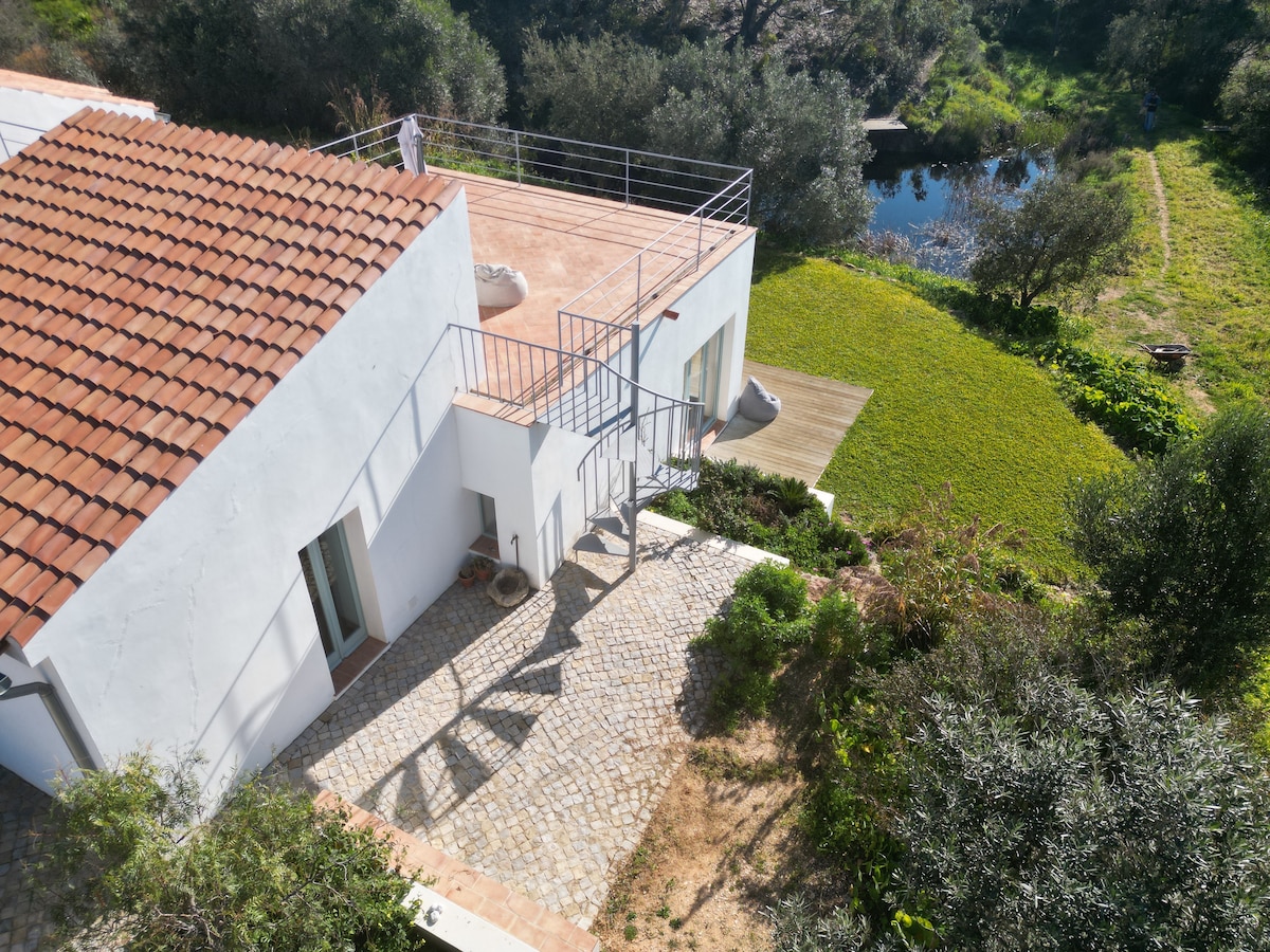 Ideal for families and nature lovers. Quiet and relaxing place in the heart of the Vicentine coast. Beautiful land with spacious, comfortable and stylish houses. A haven for beach and countryside lovers, 5 minutes from the village of Aljezur and 15 minutes from beaches for all tastes. Ecologic Taipa construction, off-the-grid, 100% solar energy with batteries, water coming from the well. You can rent Casa Poente alone or Casa Poente and Casa Nascente together.