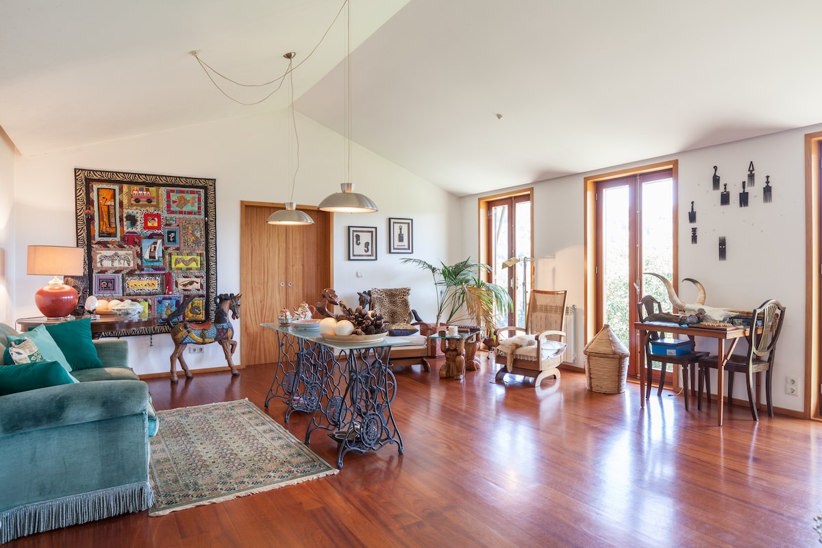 Duplex de 180m con grandes cristaleras impresionantes vistas (salón, terraza o cocina), terraza de 30m con parrilla, mesa de comer, zona de sofas. Completamente equipado y nuevo. Situado a 10' del parque de San Lázaro o Parque de las Mercedes (donde empieza la zona antigua o vinos). Para estancias superiores a 6 días se aplicará descuento en función de número de huéspedes. Completamente Equipado con Thermomix, Tv 55' salón, Tv 50' habitación secundaria, 40' habitación principal, Tv 21' cocina.