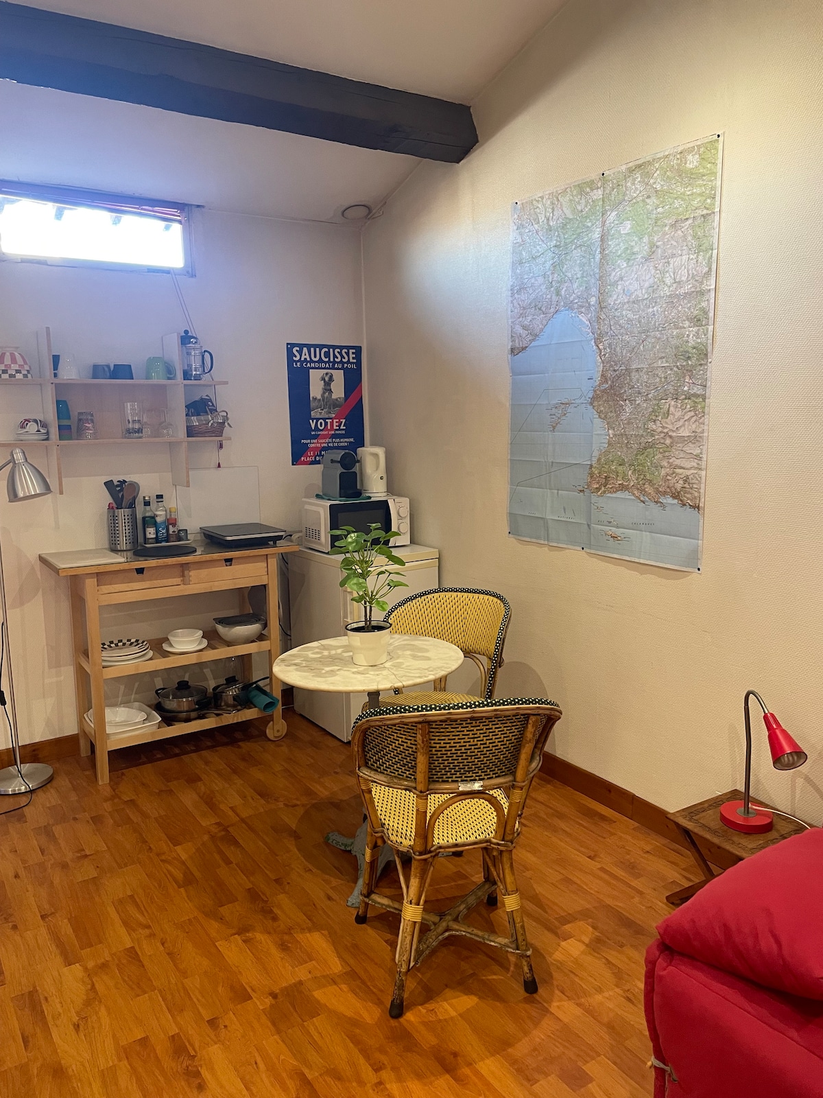 Petit studio 20 m2 indépendant en rez-de-jardin avec salle d'eau et toilette. Cafetière à disposition dans le studio avec dosette kfé fournis+ thé, petit frigo top, mange debout avec tabouret + micro onde. , il n y a pas de plaque de cuisson ni four, TV avec chaine TNT. Table et chaises de jardin en extérieur. Stationnement gratuit et privée devant la propriété fermé par un portail électrique. Village avec commerce et restauration à 10 minutes à pieds du studio.