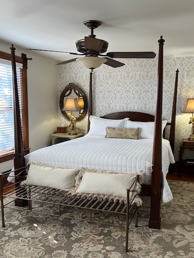 Forest Inn is your peaceful, private getaway. This second-story room offers a quaint and cozy setting. This is one of the home’s original bedrooms and maintains its historic character with a gas fireplace. Views of the woods, including the stately maple trees original to the property. Newly-installed dedicated second-story heating and cooling system provides perfect comfort. Includes a delicious breakfast and all Forest Inn amenities.