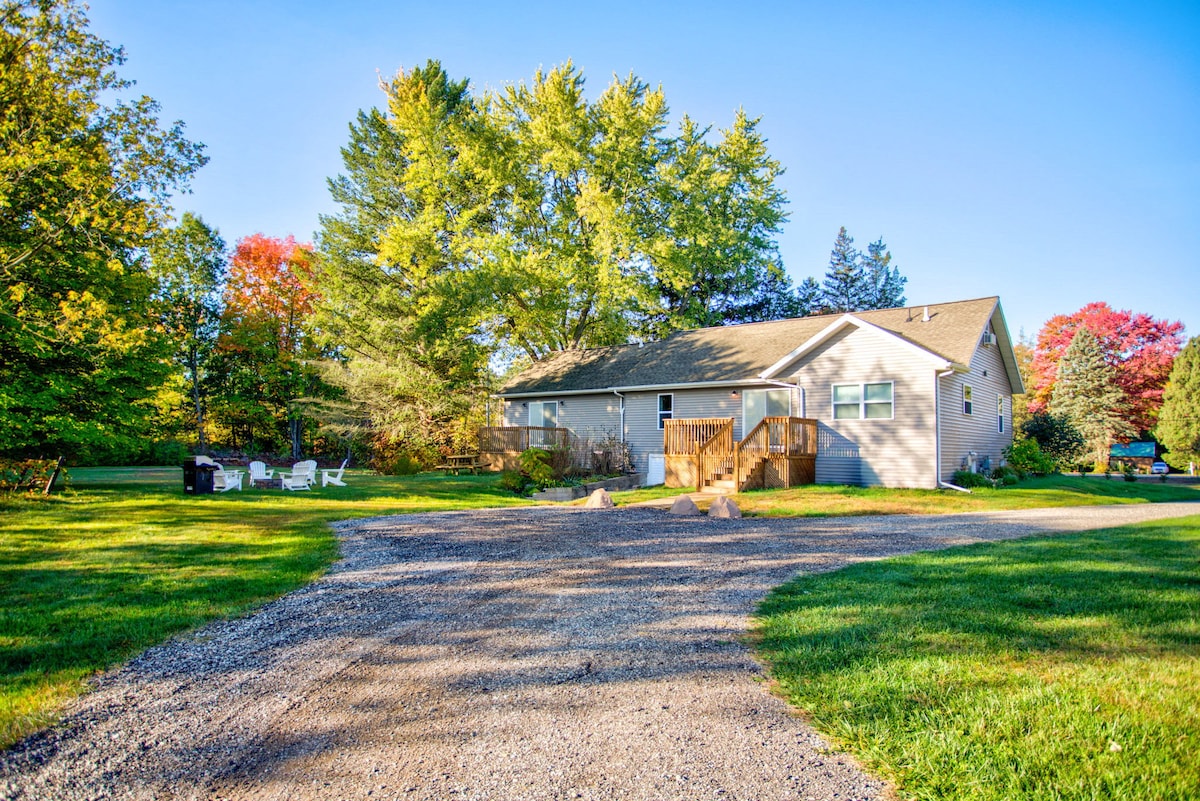 Escape to a peaceful retreat tucked in a wooded community with access to private no-wake Goshorn Lake, yet only 5 min drive to downtown Saugatuck and 10 to Oval Beach. 2 covered porches, indoor fireplace, outdoor fire pit and grill make this a perfect all-season getaway. Thoughtful layout works great for families with kids, gatherings with friends, and romantic getaways. Cabin is also next to a bike path that takes you to town (10 mins) Beach (20 mins), or Hiking (20 mins).