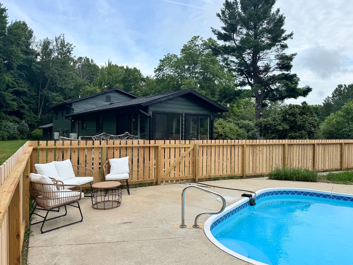 您的林中度假胜地:泳池、热水浴缸和围栏院子