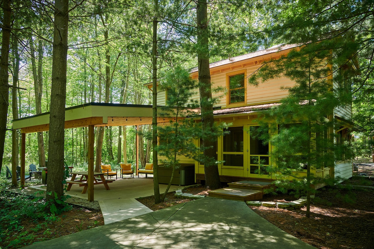 Serene, nature-filled escape in Fennville. Vacation or just feel like you’re on vacay while you remote school/work from the woods. Modern 3 bd ranch on 10 tree-covered acres. Minutes from downtown Fennville & easy access to Saugatuck/Douglas & beaches. Above ground heated pool in season, hot tub, fire pit, playset. Two living rooms & open kitchen/dining. When you’re not taking in all the outdoors have to offer, unwind in front of the fireplace. Wifi, TVs with complimentary streaming, & laundry.