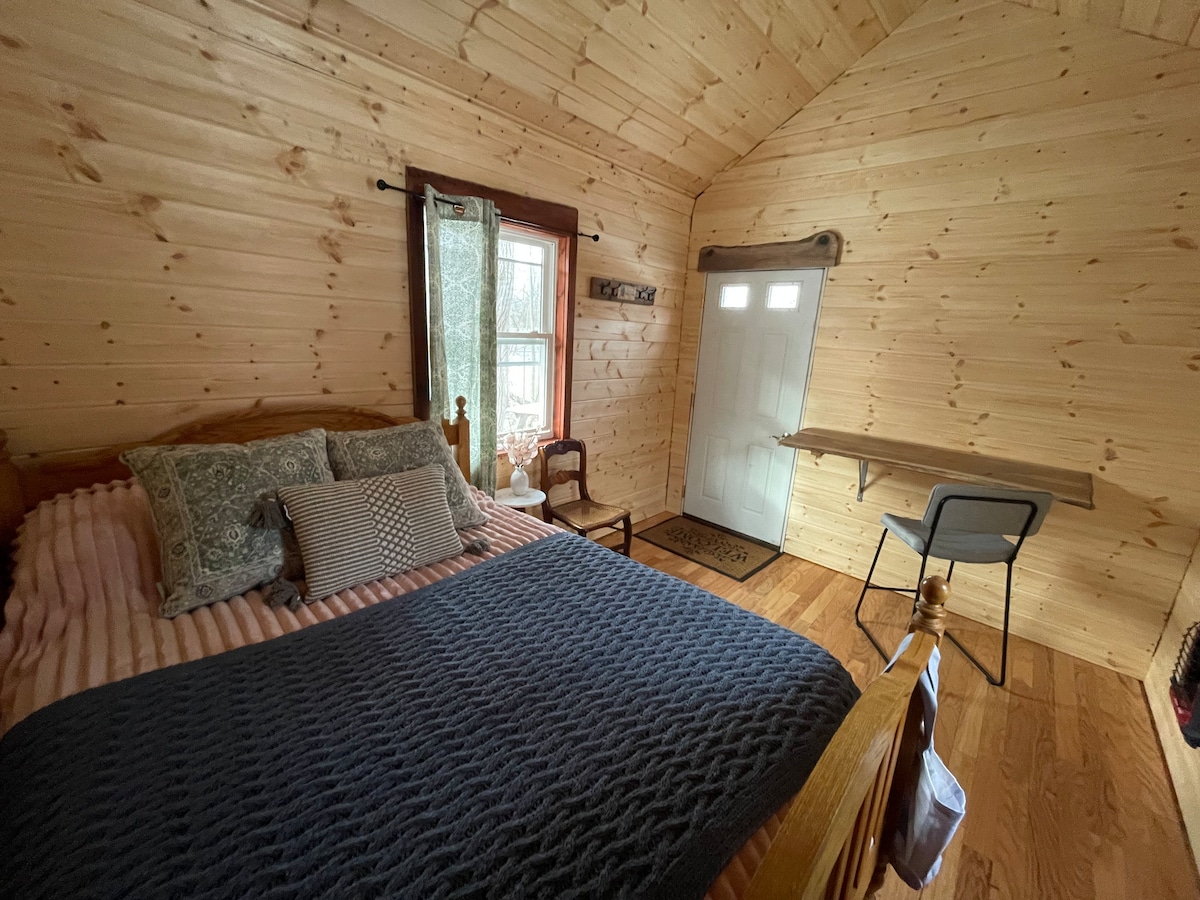 A semi remote, off the grid, newly constructed,comfortable 14' x 24' cabin with a 8' x 14' porch. Solar powered with running hot water and heat. Located on 90 acres of recreational and hunting land. The electricity is sourced from an on-site solar system, with a remote start generator to assure never losing power. This location is for those who are looking for an experience different from the hotel/motel setting. However, still providing all basic amenities Hunting is available.