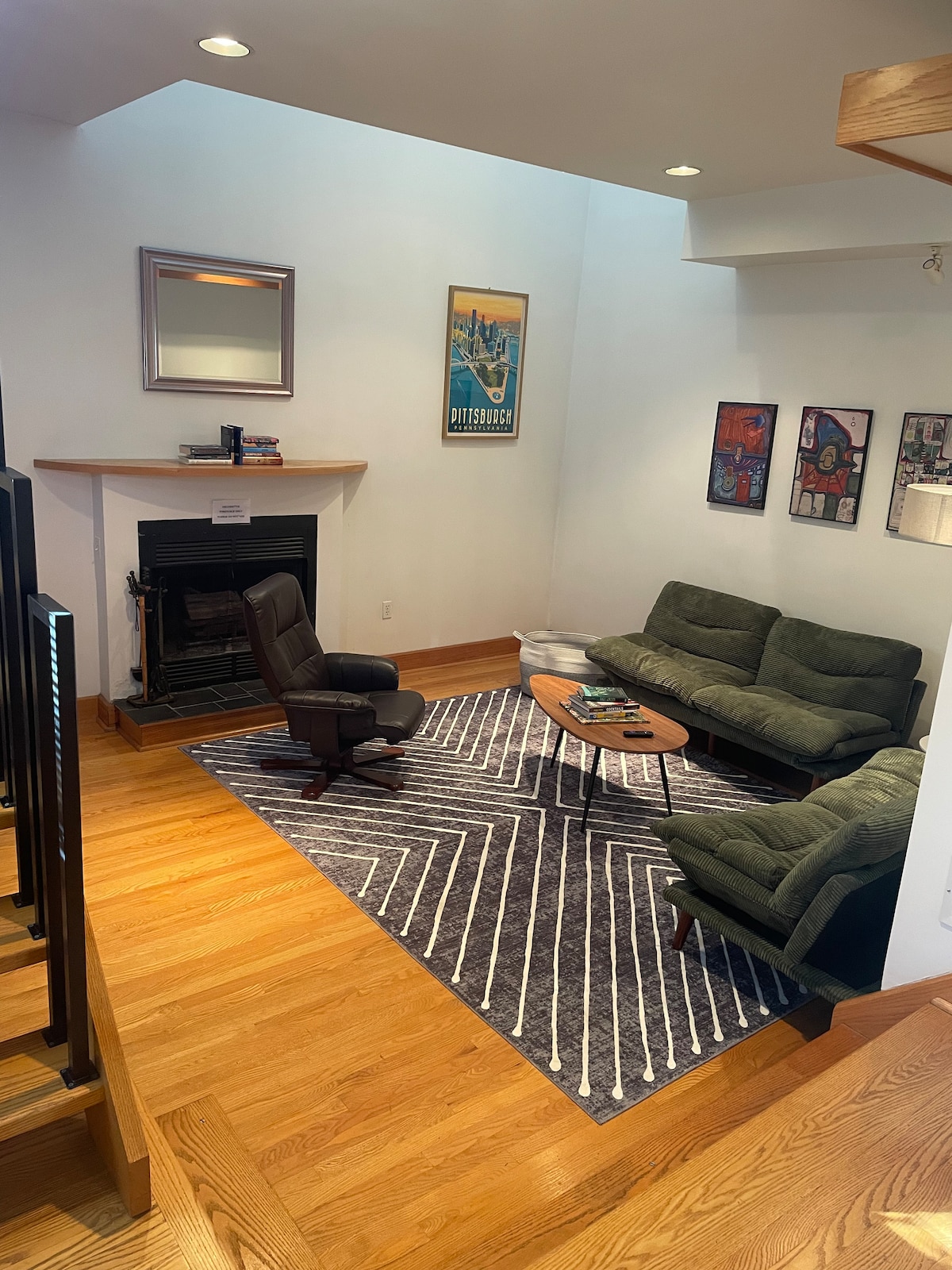 MOJO’S LOFT is a private studio with unique charm. Includes kitchen, bar top seating, dining table, sofa & recliner, queen bed, electric fireplace, patio, with small fenced in yard. Firepit by small pond on property. Close to numerous restaurants, walking trails, South Park, Mingo Park & Trax Farms. Trolley into Pittsburgh is two minutes away. Also consider our Lily Pad cabin (not pet friendly). And our new Jackson Hill Cabin (whole log cabin-style home), three bedrooms and pool table.