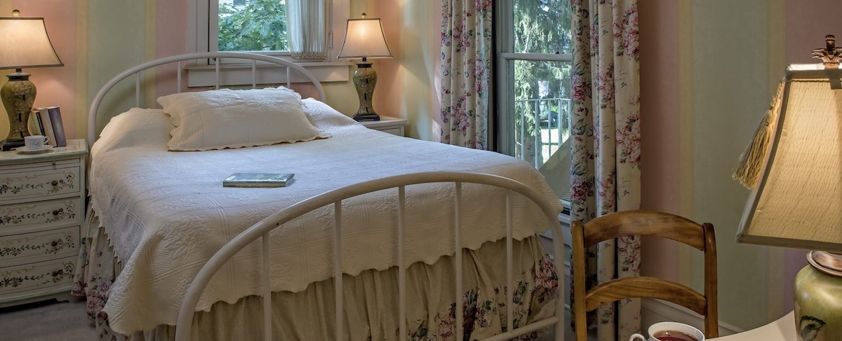 HALL HOUSE is a BnB style boutique hotel located on Main Street Brookville and listed on the National Register of Historic Places. The GARDEN SUITE offers a King Bed Room, Living Room with sofa bed and a modern Bath with both shower and bathtub. Outside is a private garden terrace and easy access to parking. There are also shared common areas including a Kitchen, Painting Gallery and Breakfast / Sunroom.