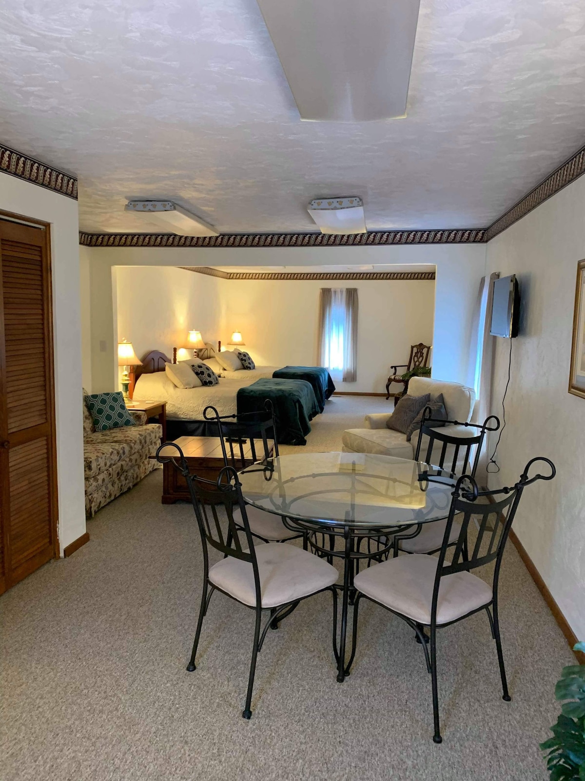 Pet-friendly, clean/fresh King bed room #12. Industrial modern feel. Comfy bedding, spacious bath, sitting area and lots of pampering goodies while you enjoy our beautiful riverfront resort location. This room can accommodate one well-behaved dog 50 lbs or less. Dog must be supervised / leashed / and cleaned up after. Guests are not permitted to leave dog unattended in room. Pet fee applies $100 for stay.
