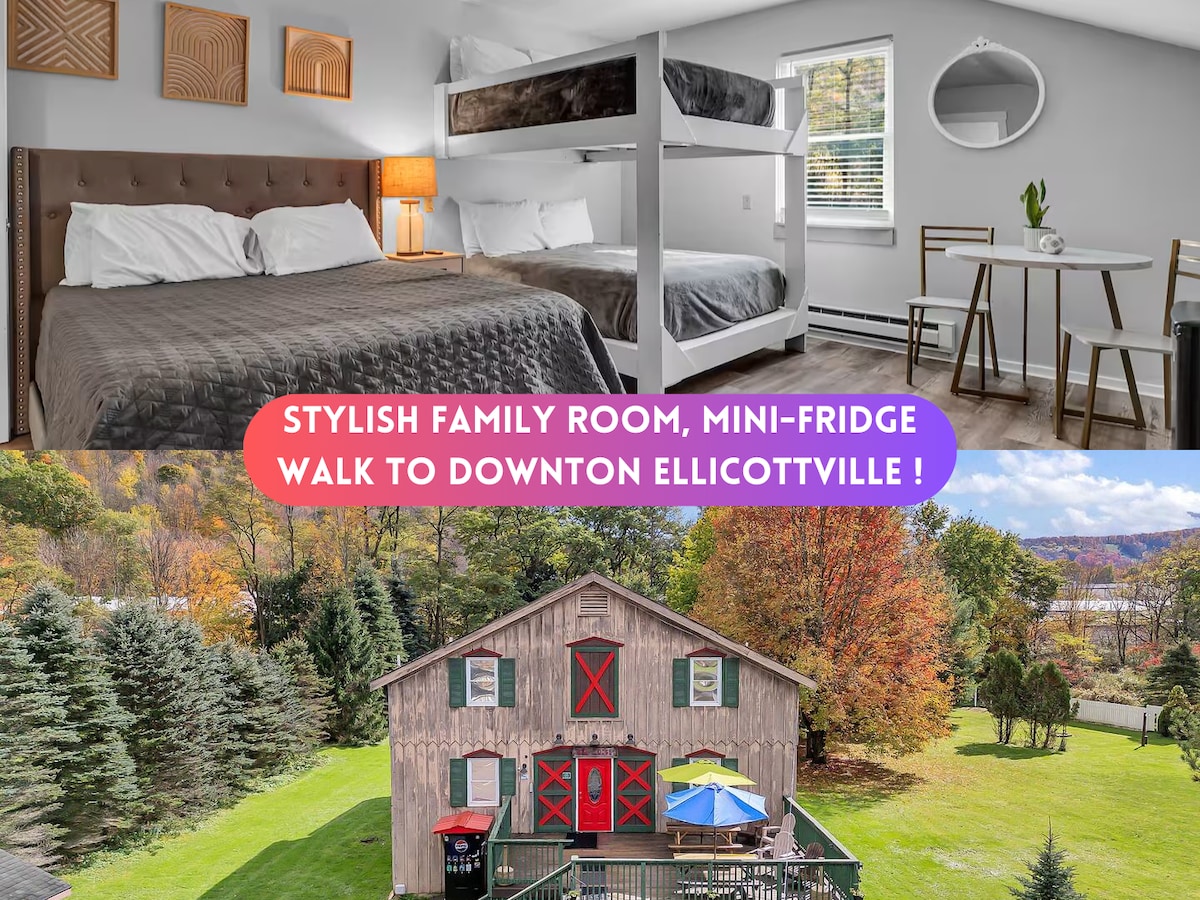➤ Timberline Lodge — Your Walk-Everywhere Downtown Ellicottville Escape! ★ 5mins drive to Holiday Valley Ski Resort & Slopes ➤ This room is located on the main level, includes a mini-fridge beneath your 43 inch Smart TV with Netflix configured, and free high-speed WIFI. • Fresh linens will be found on our comfortable queen bed in the room. • En-suite full-sized bathroom is stocked with bathroom amenities & additional towels. • Perfect for ski weekends & all-season value for money stay