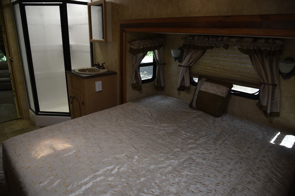Reconnect with nature at this unforgettable escape. the camper has a queen size memory foam mattress, there is also a pull-out couch, set of bunk beds and the table folds into a bed if needed. There is kitchen stove, oven, microwave, sink with hot water and an indoor bathroom and shower room.