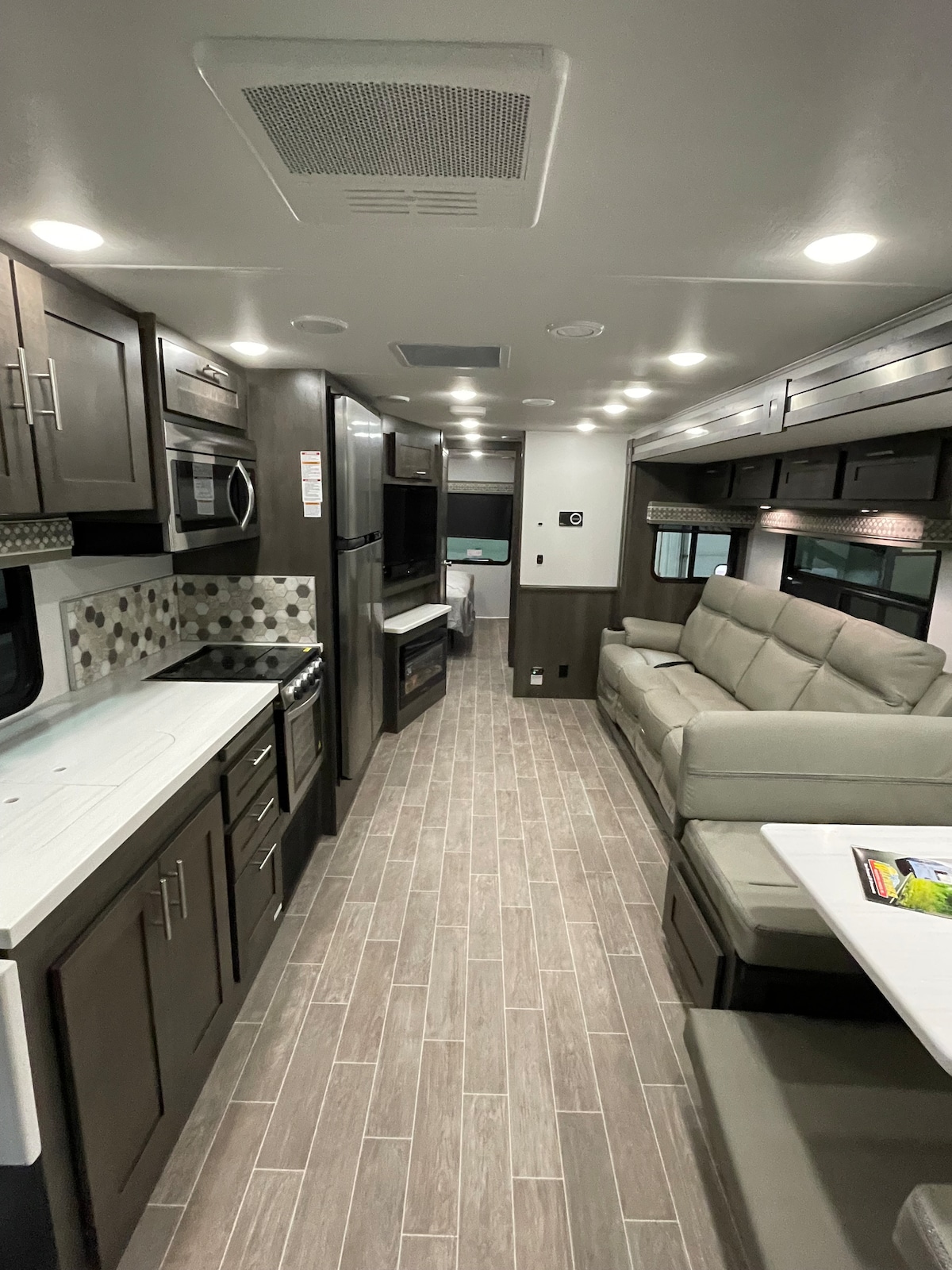 The camper is one room with a queen bed and 2 bunk beds. The camper also has a couch. The things included in the full kitchen are a microwave, a stovetop, an oven, and a full fridge. It also includes a coffee maker, toaster, pots and frying pan, and utensils. There is 1 full bath in the camper. We provide a bottom fitted sheet on the queen-size bed and the bunk beds. Bring your own pillows, blankets, towels, and wash clothes. The camper has its own picnic table and fire ring.