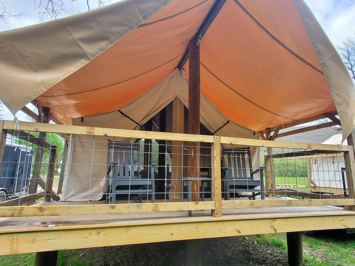 Come and enjoy nature with modern comfort in our glamp tent. Enjoy a queen bed with linens, table/cookware/dishes for two, lockable storage, propane heat, lighting, and outdoor rocking chairs with a creek side view. A firepit/picnic table are included with parking to the right. A short walk takes you to a contemporary shower house, or just a few steps away is an outhouse. There is no electric available in the glamp tents but there are standard charging receptacles at the lower pavilion to use.