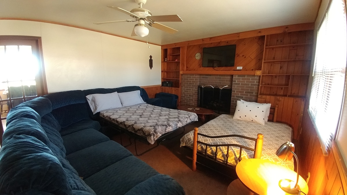 加大双人床…… 林木风景,3/2 允许携带宠物入住,配备烧烤架