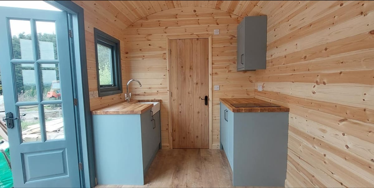 The Orchard is our luxurious custom built Shepherd's Hut for two, set on a working farm surrounded by idyllic nature. Enjoy amazing views of the surrounding rolling countryside, a perfect tranquil location. Appointed to a high standard with underfloor heating, the sizeable open plan living space has a bespoke fitted kitchen, oven, hob, dining table, smart TV and double bed. Ensuite bathroom with luxurious shower. Large outdoor seating area with combi firepit/BBQ swing arm for you to relax.