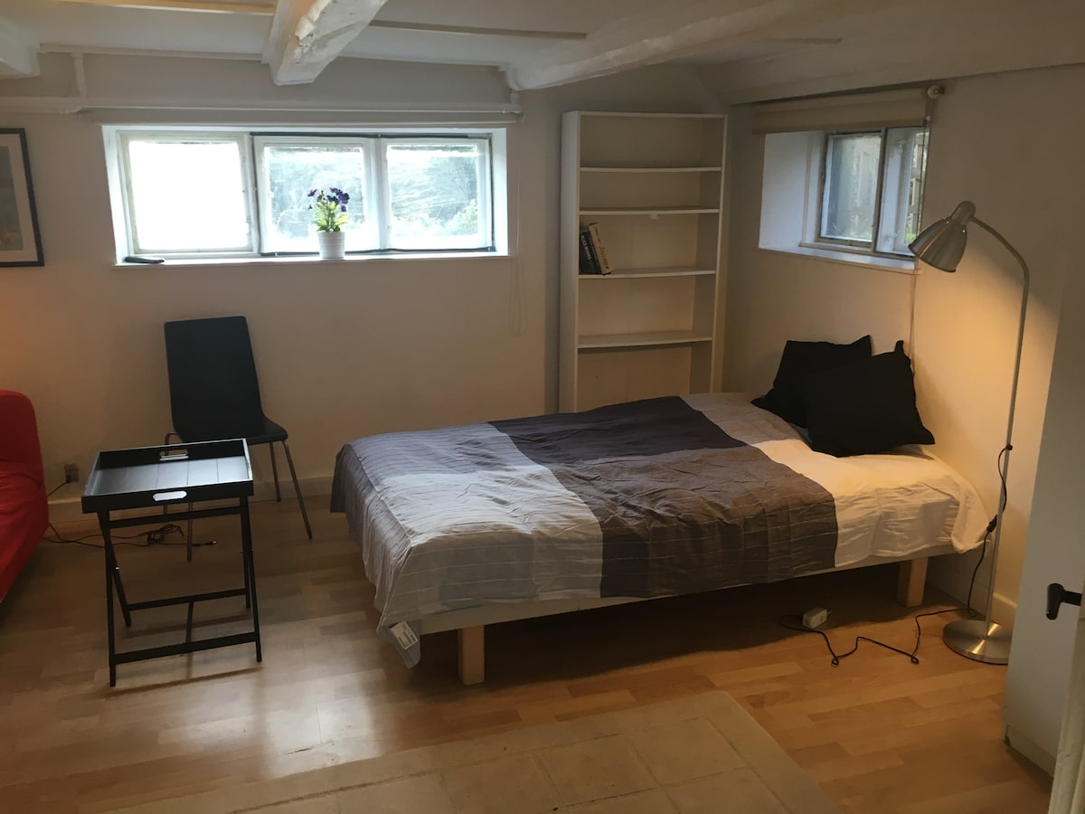 Velkommen til vores kælderlejlighed! Du har hele etagen for dig selv med soveværelse, stue, badeværelse og fuldt udstyret køkken. Hyggelig beliggenhed tæt på Furesø og naturen. Vi bor ovenpå med vores 8 måneder gamle datter. Etagerne er forbundet med trappe. Værelse, stue og bad er helt private, men fodtrin og lyde forekommer da vi er en børnefamilie. Ideel til både pendleren og familie-weekendturen. Ekstra madras til børn kan stilles til rådighed. Vi udlejer bil på GoMore, kontakt os for info