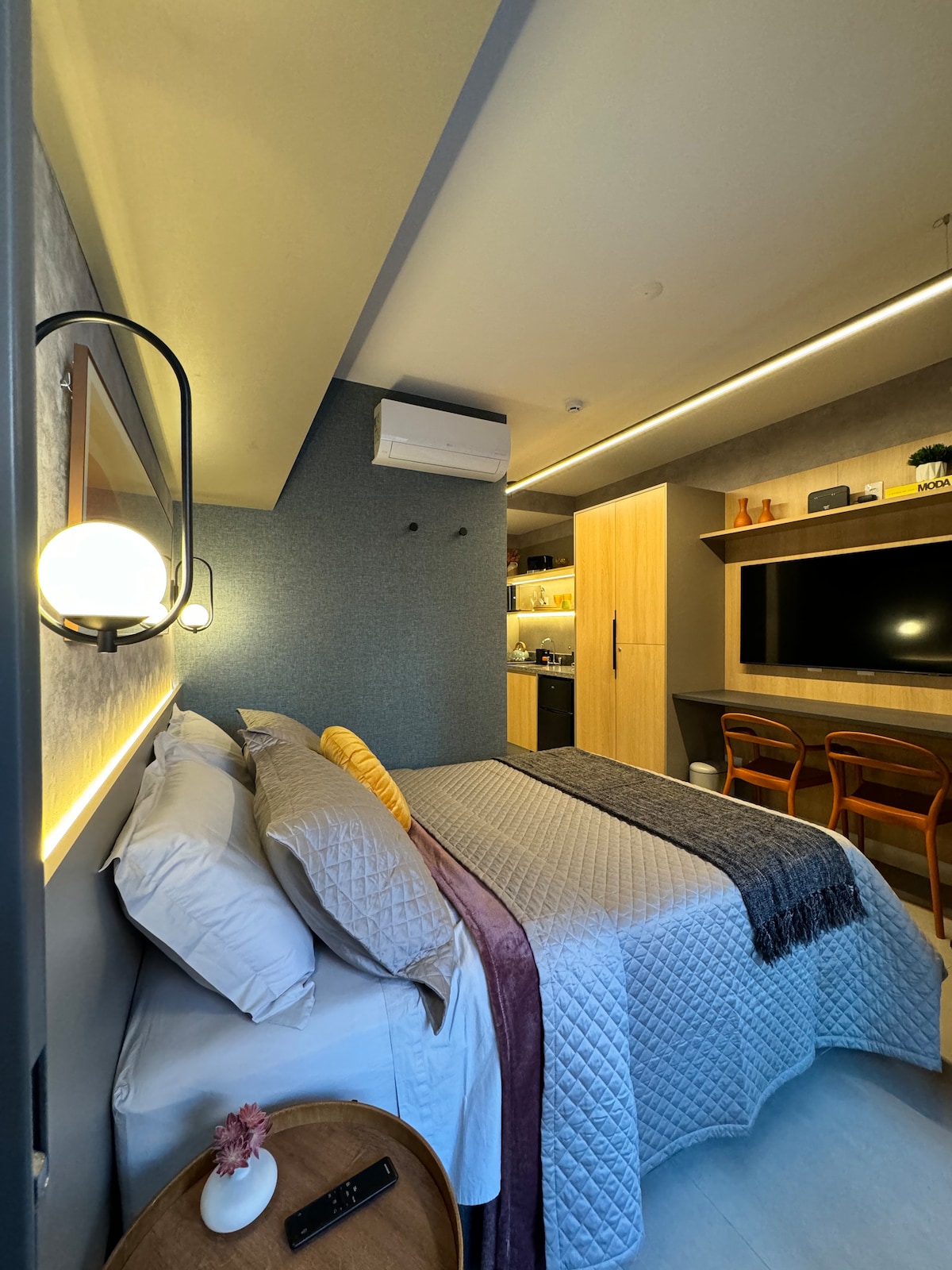 Lindo apto localizado na região de Perdizes cheio de estilo. Studio super completo com toda estrutura, ar condicionado, banheiro privativo, cozinha, geladeira, microondas, Smart TV, Wi-fi rápido, varanda com uma vista incrível. O Condomínio possui toda estrutura necessária para seu conforto, piscina, academia, coworking, lavanderia. Possui uma localização espetacular com vista para o estádio Allianz Parque palco de diversos shows e jogos. E ao lado de dois shoppings (Bourbon e West Plaza).