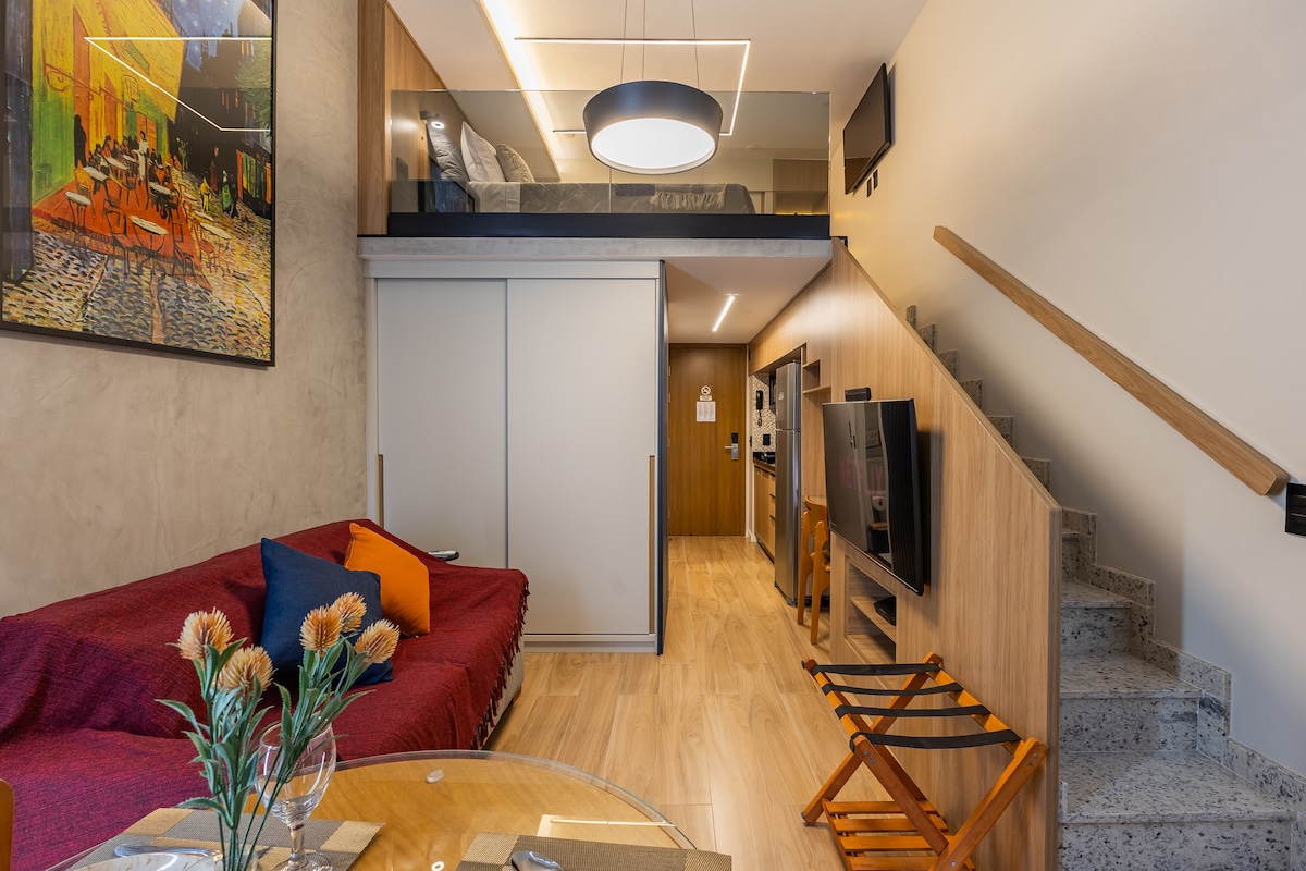 Viva uma experiência única nesse novíssimo Loft Duplex com vista espetacular na melhor região de São Paulo. Experiência e Tecnologia > vista deslumbrante > automação dos ambientes > wi-fi de alta velocidade > smart TV com acesso a internet Conforto e Sofisticação > ar condicionado quente frio > persianas black out > cama king Excelente Localização > a 300m do metrô Oscar Freire > vaga de garagem Condomínio Completo > piscina no rooftop > academia > coworking > portaria presencial 24h