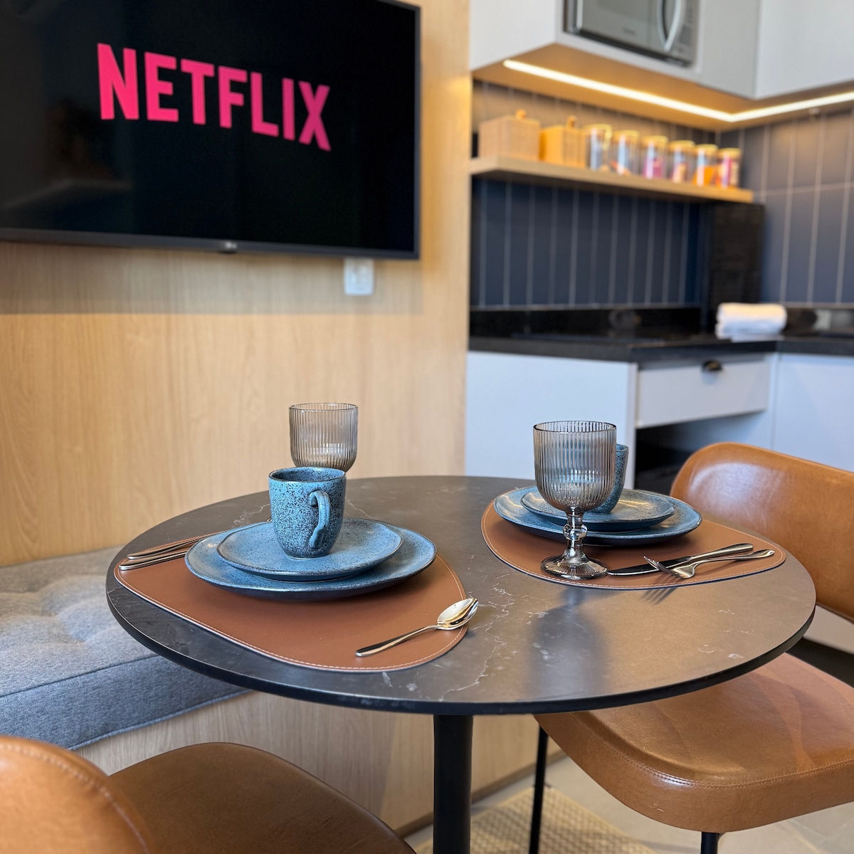 Esta acomodação elegante é perfeita para quem quer passar os dias com total conforto e qualidade de vida. Seja sozinho ou em família, o loft conta com todas as comodidades possíveis como Internet de fibra ótica, Wi-Fi, fogão por indução, geladeira, máquina de lavar, Escritório com internet cabeada, Smart TV giratória 4K HDR 55 Polegadas, Canais abertos e pagos etc