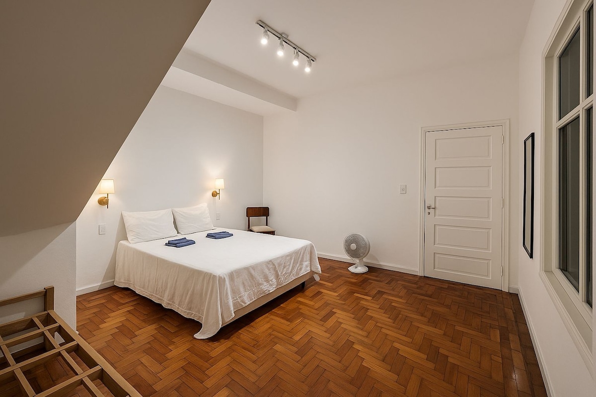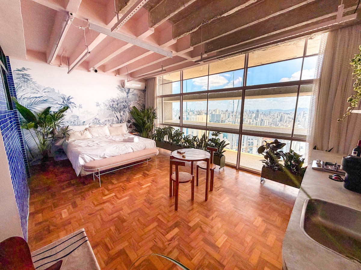 No último andar do Copan, este apartamento é um tributo às mulheres do modernismo brasileiro, como Pagu, Anita Malfatti e Tarsila do Amaral. Com uma atmosfera artística e acolhedora, o espaço combina design, história e personalidade. A cama king size convida ao descanso absoluto, enquanto as amplas janelas revelam um pôr do sol inesquecível sobre a cidade — um espetáculo diário que transforma cada estadia em experiência única.
