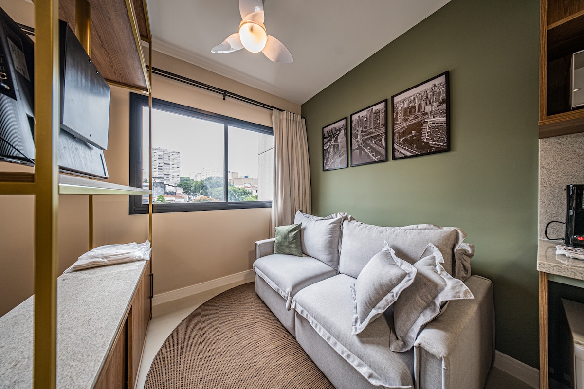 Studio 40011: 4 min do Allianz Parque. Estúdio compacto, moderno e completo e confortável em uma das regiões mais culturais de SP. 📍 Cercado por cafés, restaurantes e shows. Aqui a cidade pulsa ✨ Cama aconchegante, bancada, armário, ar-condicionado, TV, e cozinha equipada com sanduicheira, air fryer, cafeteira, fogão, geladeira. 🚿 Banheiro privativo e iluminação acolhedora. com aquele clima de "quero ficar mais um pouco" Perfeito para curtir, descansar ou trabalhar. Reserve agora!