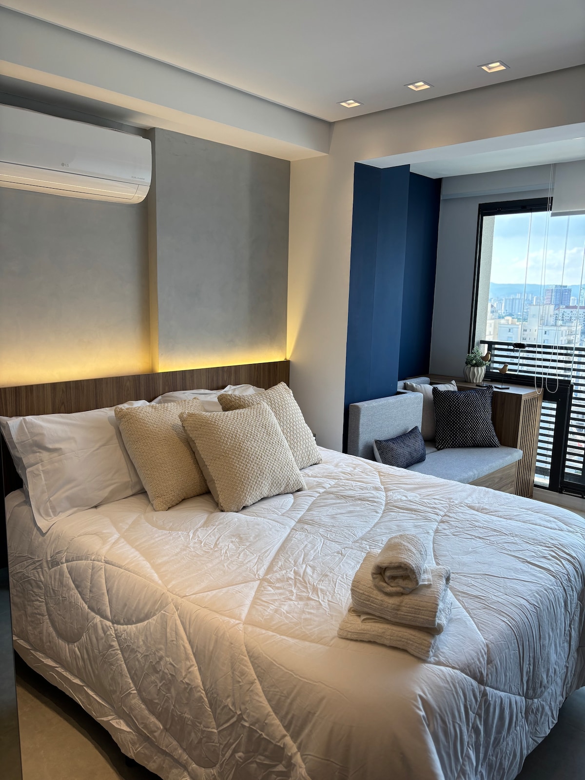 Brand new apartment, with a contemporary style, of a high standard and very well located, with a privileged view of Allianz Parque. Next to shopping malls, various businesses, means of transport, parks, tourist attractions and business buildings. The studio is complete, with a comfortable queen bed, Smart TV and Internet. Kitchen with all utensils, cooktop, refrigerator and microwave. With parking (rotary). Close to everything, cozy, perfect for experiencing fantastic moments.