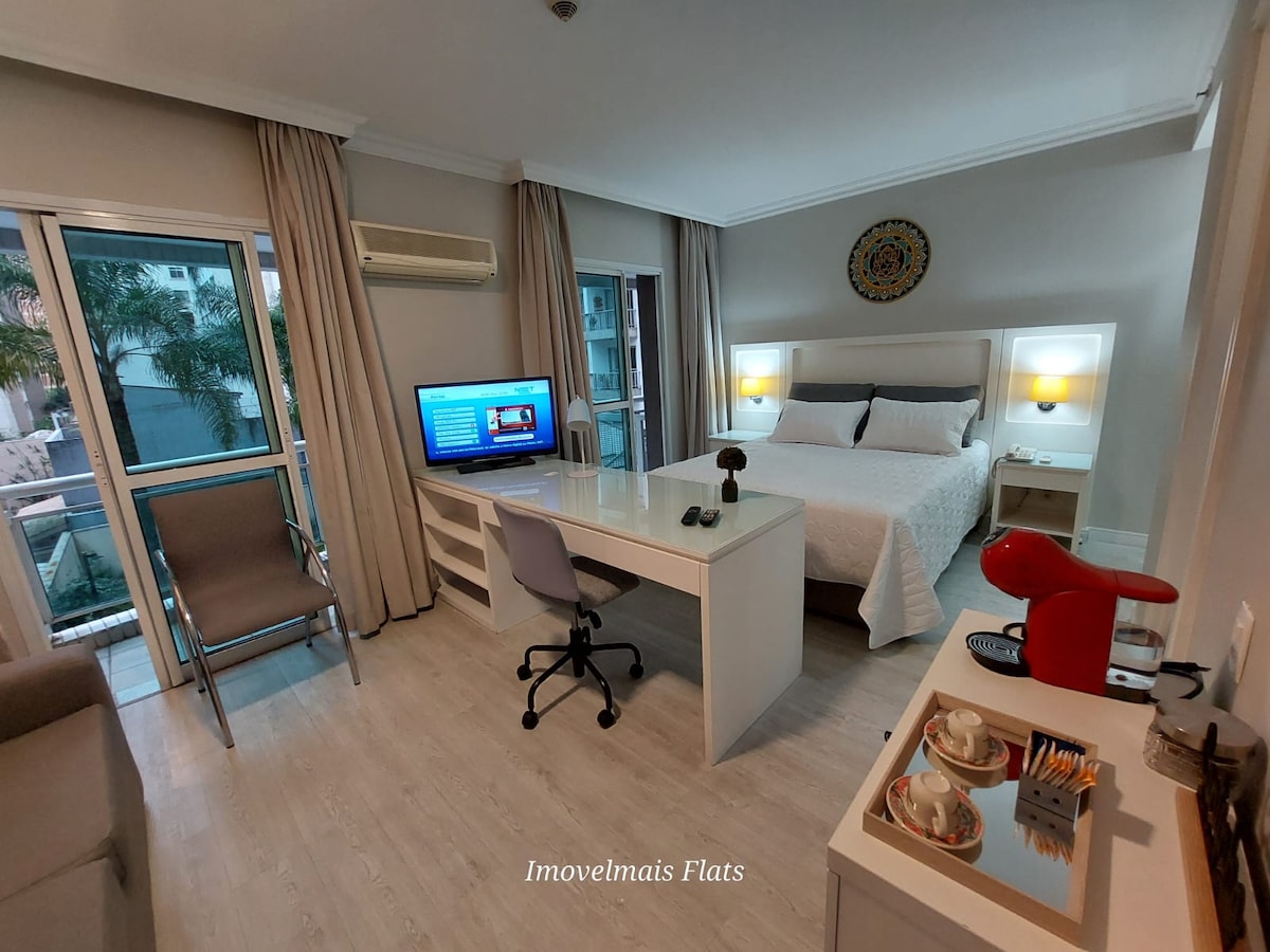 High standard, built in January/2018, decorated and equipped for your comfort and well-being. It has a modern, clean decor, and the furniture and utensils are top of the line. The studio integrates living room/suite. Bathroom with built-in closet. Central gas heating. Full kitchen and service area with built-in closets. Balcony closed with roller blinds.