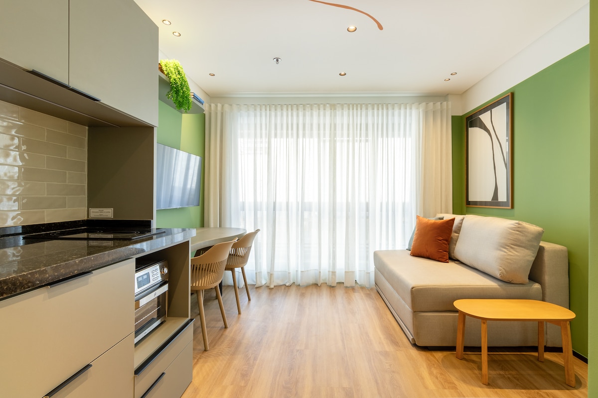 Brand new apartment, with a contemporary style, of a high standard and very well located, with a privileged view of Allianz Parque. Next to shopping malls, various businesses, means of transport, parks, tourist attractions and business buildings. The studio is complete, with a comfortable queen bed, Smart TV and Internet. Kitchen with all utensils, cooktop, refrigerator and microwave. With parking (rotary). Close to everything, cozy, perfect for experiencing fantastic moments.