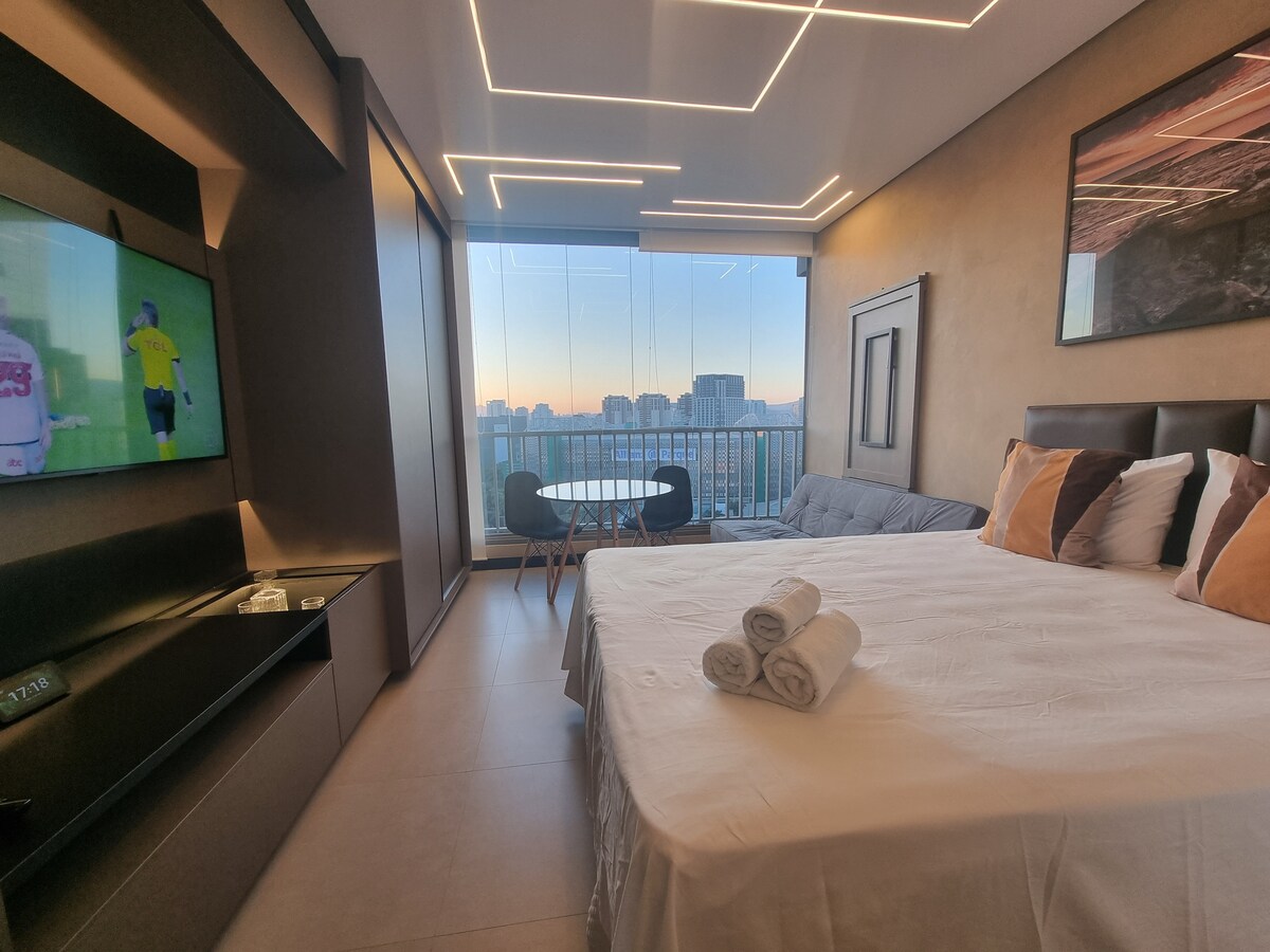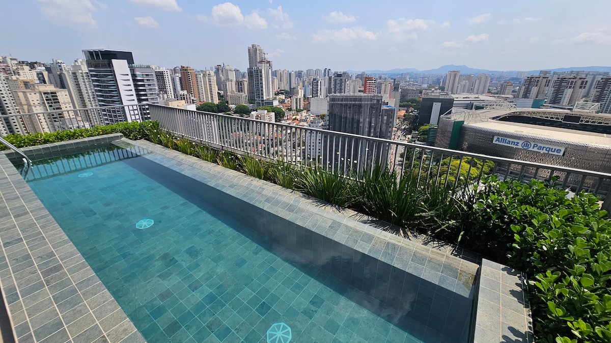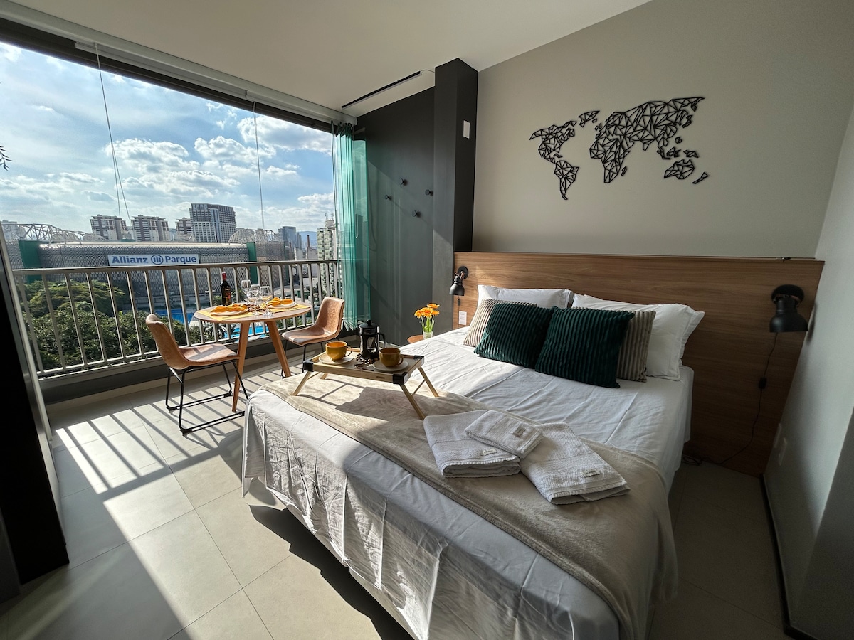 Brand new apartment, with a contemporary style, of a high standard and very well located, with a privileged view of Allianz Parque. Next to shopping malls, various businesses, means of transport, parks, tourist attractions and business buildings. The studio is complete, with a comfortable queen bed, Smart TV and Internet. Kitchen with all utensils, cooktop, refrigerator and microwave. With parking (rotary). Close to everything, cozy, perfect for experiencing fantastic moments.