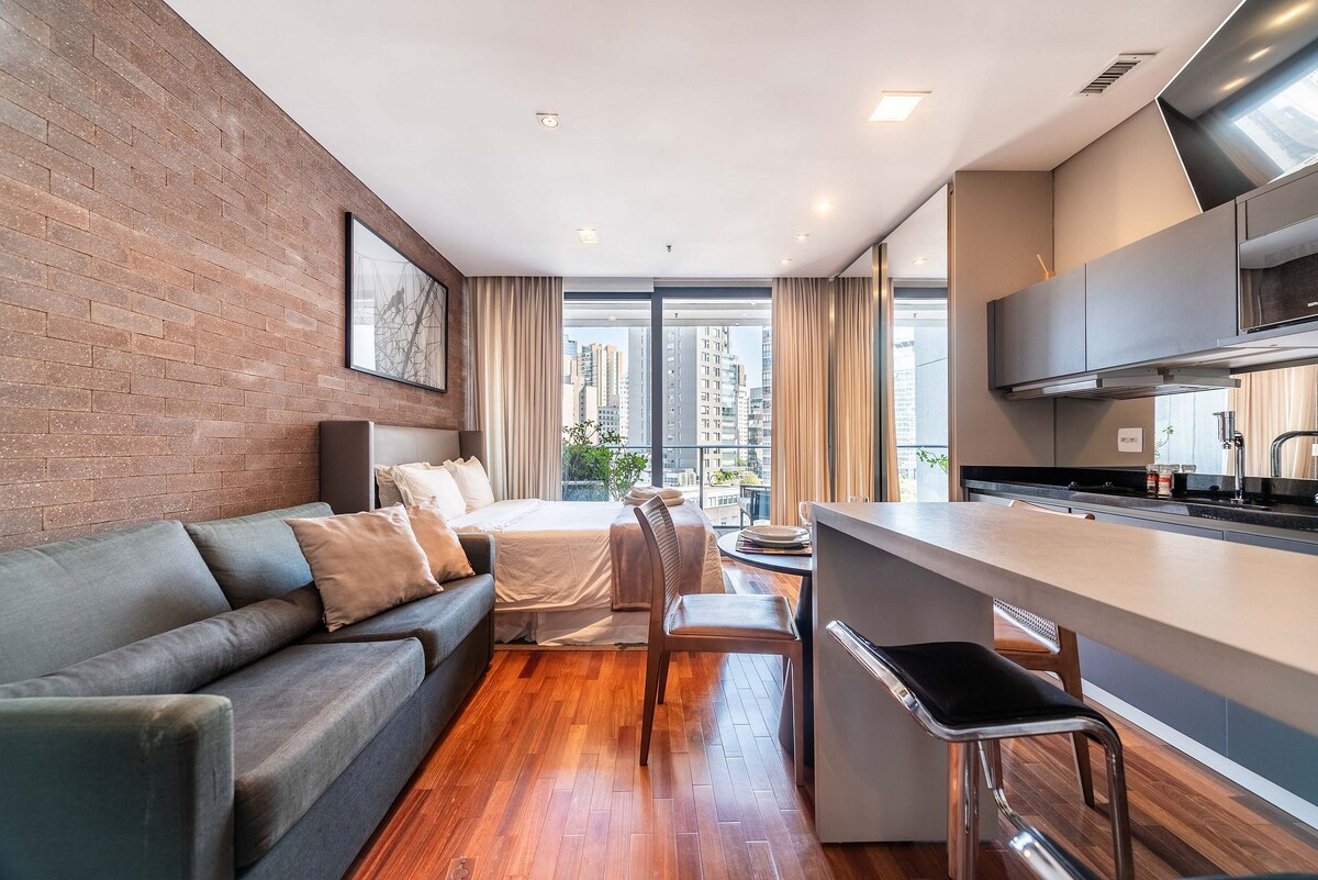 Modern and super cozy studio just 50 m from Oscar Freire metro station, cleaned thoroughly after each stay. Accommodates up to 2 guests comfortably. Includes workspace and dining area, Smart TV with streaming access, unlimited Wi-Fi, and a fully equipped compact kitchen with fridge, cooktop, and microwave. The building offers: Swimming pool Gym Laundry Co-working space Convenience store on-site Café Market 190 m away Located in São Paulo’s most upscale area