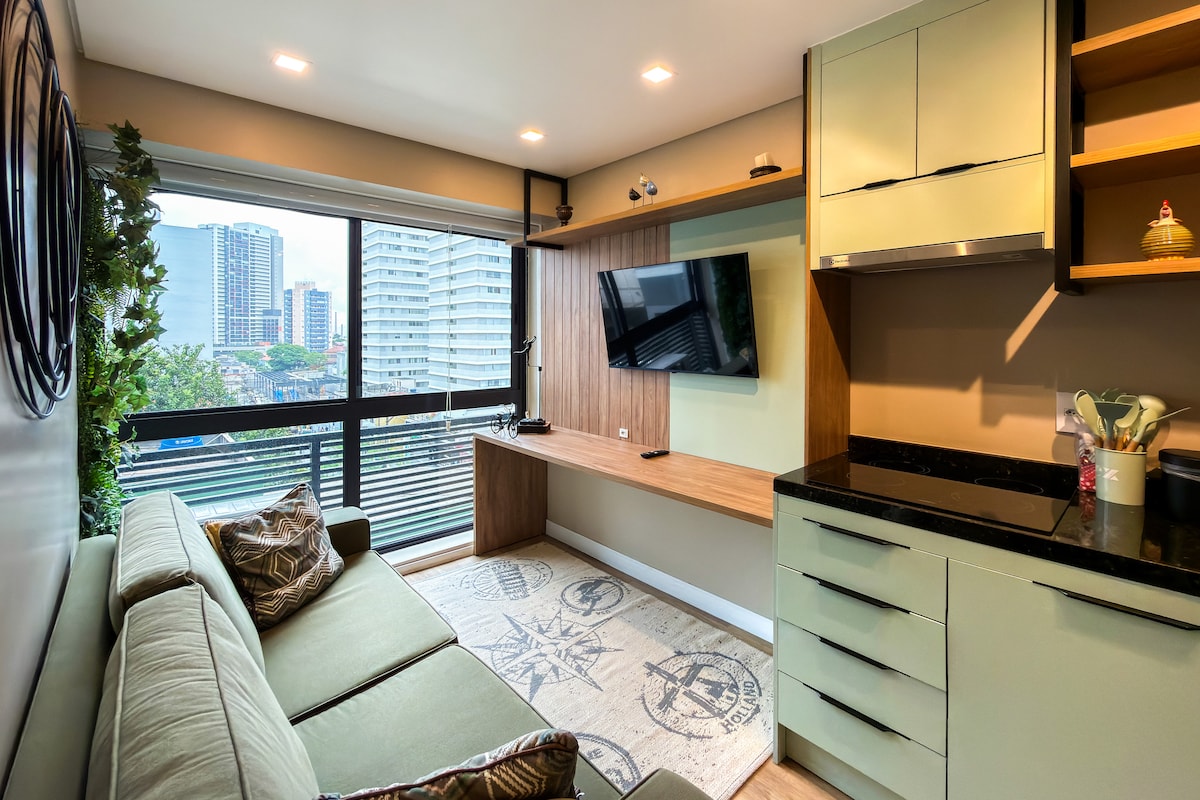 Brand new apartment, with a contemporary style, of a high standard and very well located, with a privileged view of Allianz Parque. Next to shopping malls, various businesses, means of transport, parks, tourist attractions and business buildings. The studio is complete, with a comfortable queen bed, Smart TV and Internet. Kitchen with all utensils, cooktop, refrigerator and microwave. With parking (rotary). Close to everything, cozy, perfect for experiencing fantastic moments.