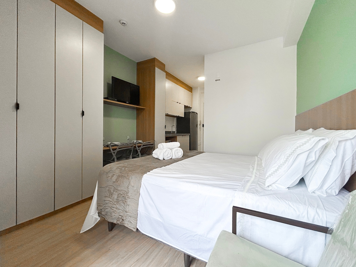 Studio 40011: 4 min do Allianz Parque. Estúdio compacto, moderno e completo e confortável em uma das regiões mais culturais de SP. 📍 Cercado por cafés, restaurantes e shows. Aqui a cidade pulsa ✨ Cama aconchegante, bancada, armário, ar-condicionado, TV, e cozinha equipada com sanduicheira, air fryer, cafeteira, fogão, geladeira. 🚿 Banheiro privativo e iluminação acolhedora. com aquele clima de "quero ficar mais um pouco" Perfeito para curtir, descansar ou trabalhar. Reserve agora!