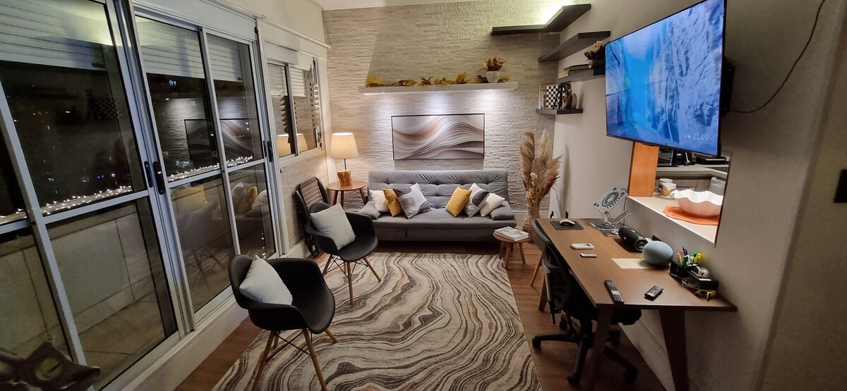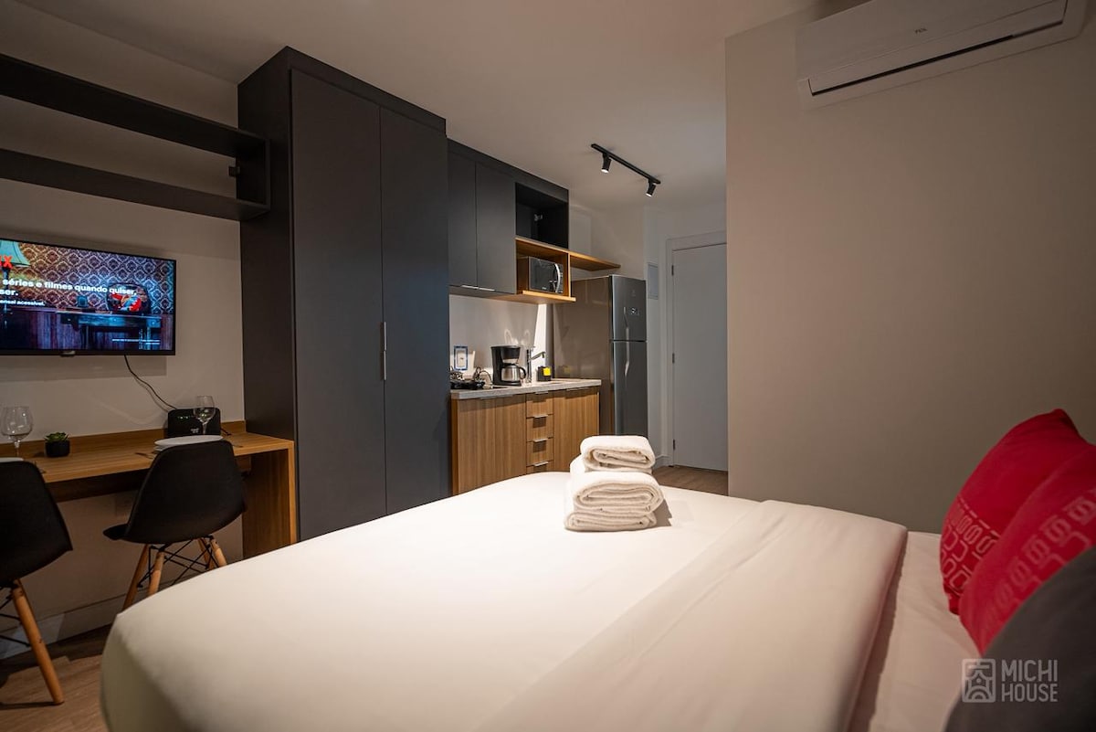 Enjoy a modern and comfortable 25m² studio in the heart of Perdizes, São Paulo. The apartment is located right in front of Allianz Arena, perfect for concerts, football matches, business trips, or weekend getaways. The space was designed for a relaxing and practical stay, with high-quality bedding, a fully equipped kitchenette, fast Wi-Fi, air conditioning, and a comfortable queen bed. Everything is ready for you.