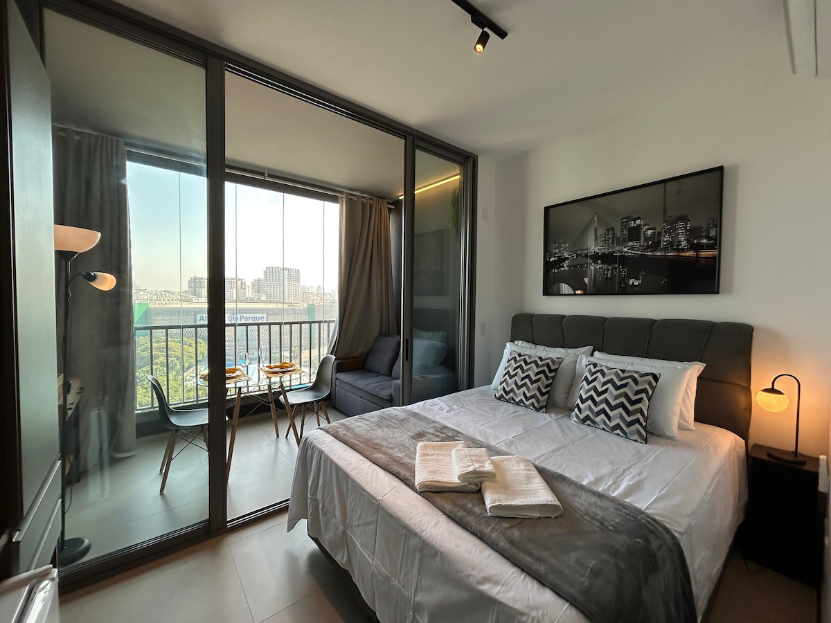 Brand new apartment, with a contemporary style, of a high standard and very well located, with a privileged view of Allianz Parque. Next to shopping malls, various businesses, means of transport, parks, tourist attractions and business buildings. The studio is complete, with a comfortable queen bed, Smart TV and Internet. Kitchen with all utensils, cooktop, refrigerator and microwave. With parking (rotary). Close to everything, cozy, perfect for experiencing fantastic moments.