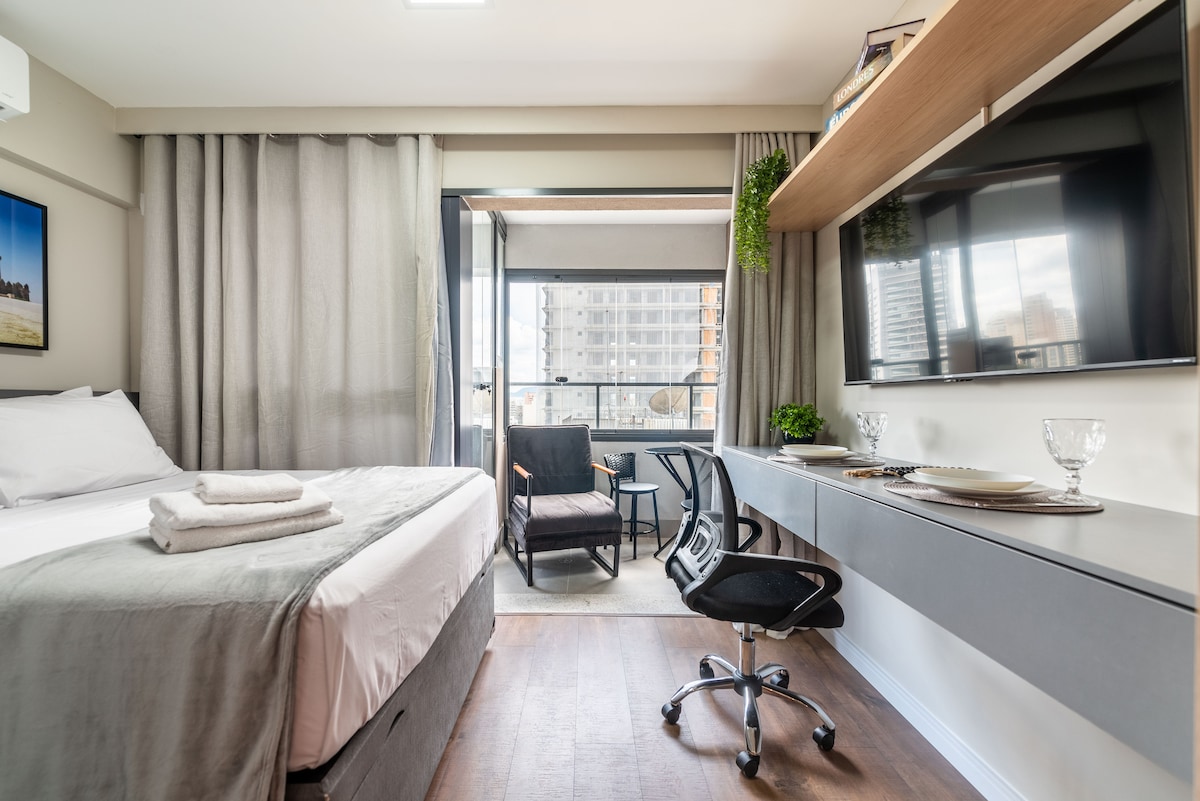 Experience One Eleven in Vila Olimpia. This modern apartment features large windows with breathtaking city views and natural light. The unit boasts 600 Mbps internet and a 4K HD TV. For total comfort, it has a Hot/Cold AC system: 27,000 BTU/h unit in the living room and 10,000 BTU/h in the bedroom. The bedroom is quiet and dark for a restful sleep. Impeccably maintained, you’ll be walking distance to top restaurants and business hubs—a safe, upscale retreat with a stunning urban backdrop.