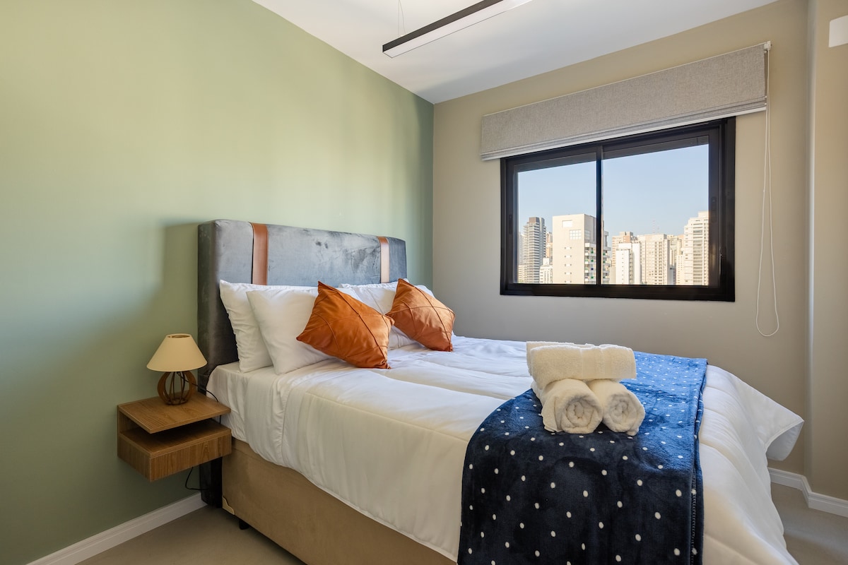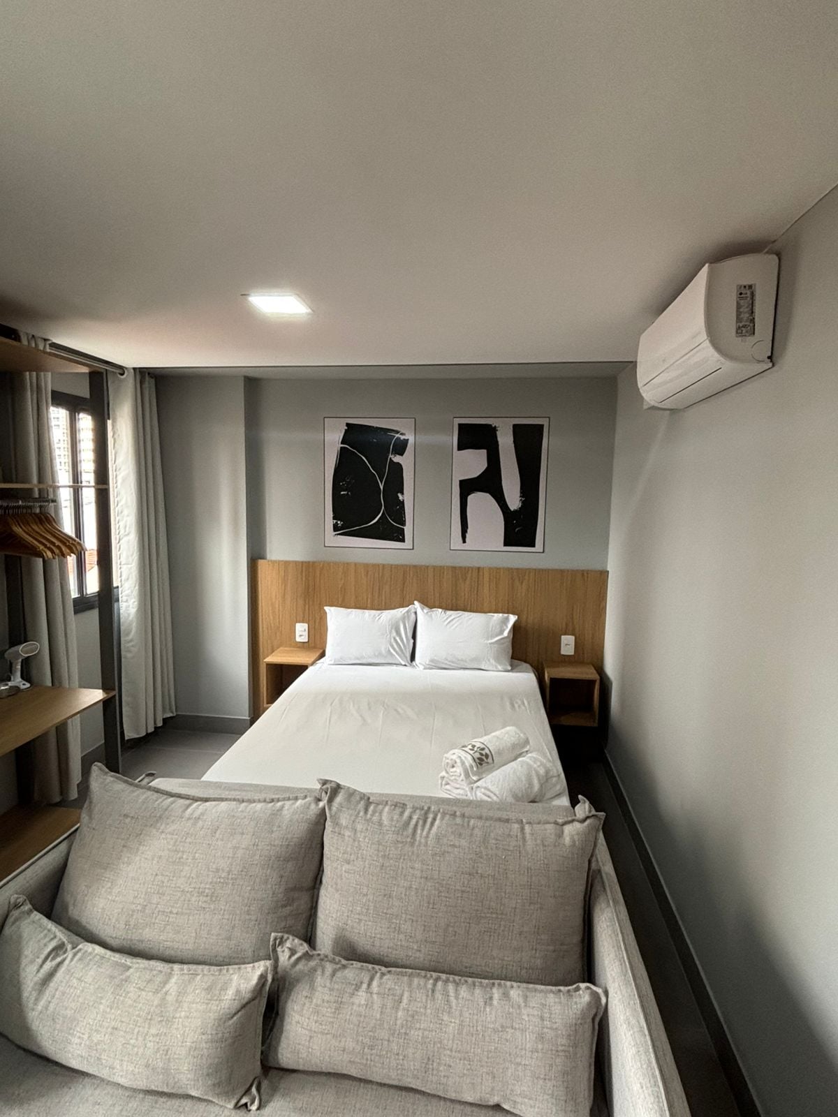 Studio 40011: 4 min do Allianz Parque. Estúdio compacto, moderno e completo e confortável em uma das regiões mais culturais de SP. 📍 Cercado por cafés, restaurantes e shows. Aqui a cidade pulsa ✨ Cama aconchegante, bancada, armário, ar-condicionado, TV, e cozinha equipada com sanduicheira, air fryer, cafeteira, fogão, geladeira. 🚿 Banheiro privativo e iluminação acolhedora. com aquele clima de "quero ficar mais um pouco" Perfeito para curtir, descansar ou trabalhar. Reserve agora!